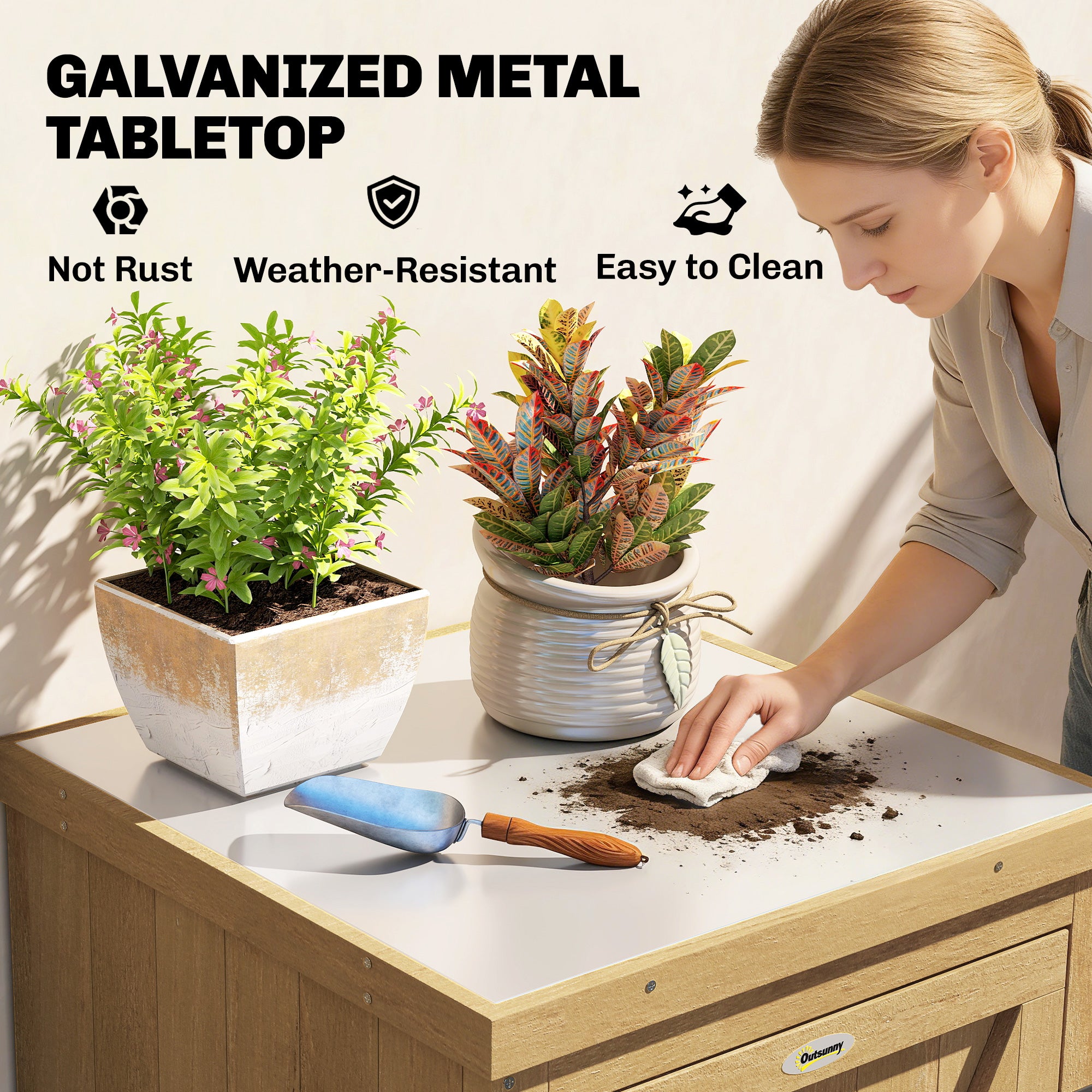 - Two-tier structure with a shelf neatly organizes your garden tools and supplies