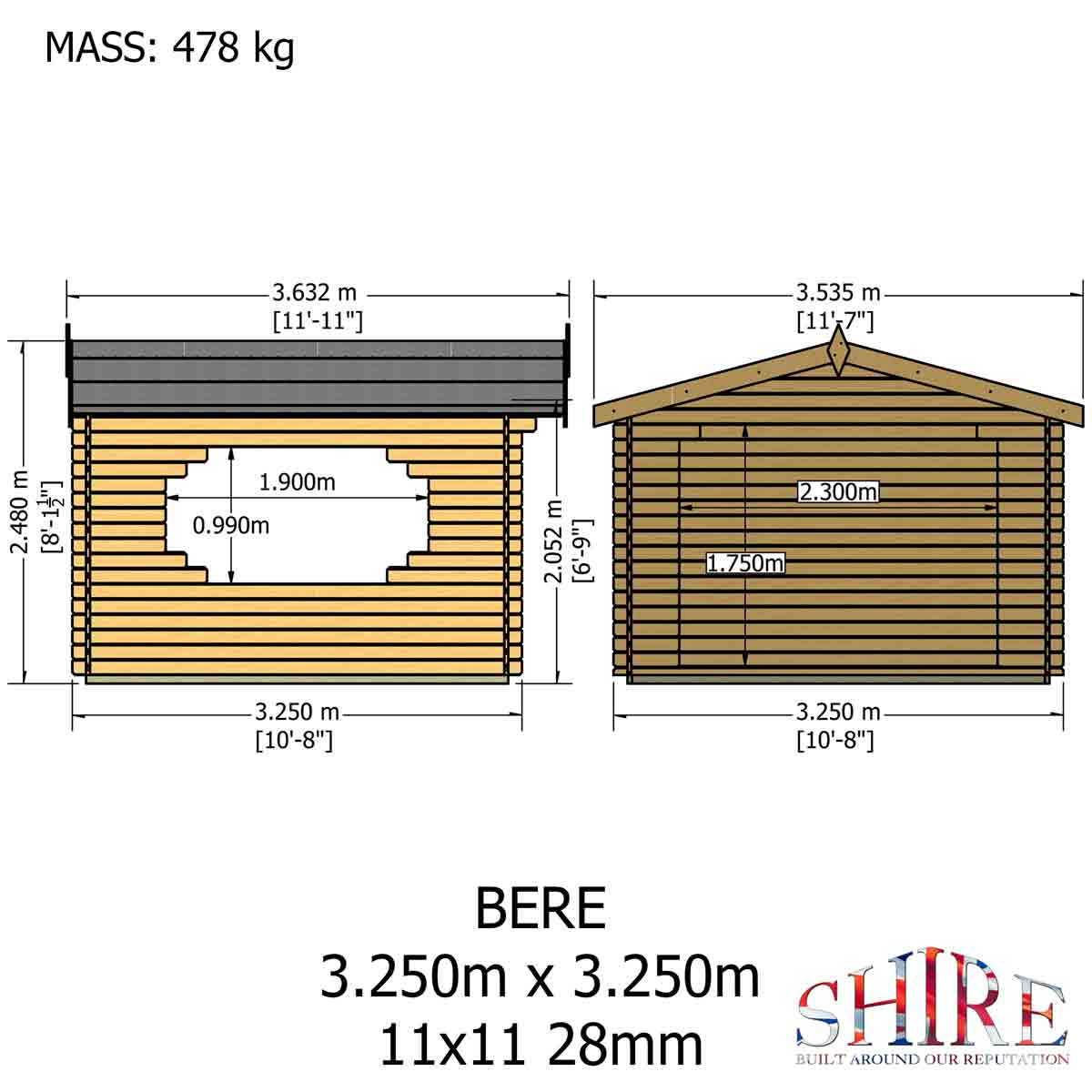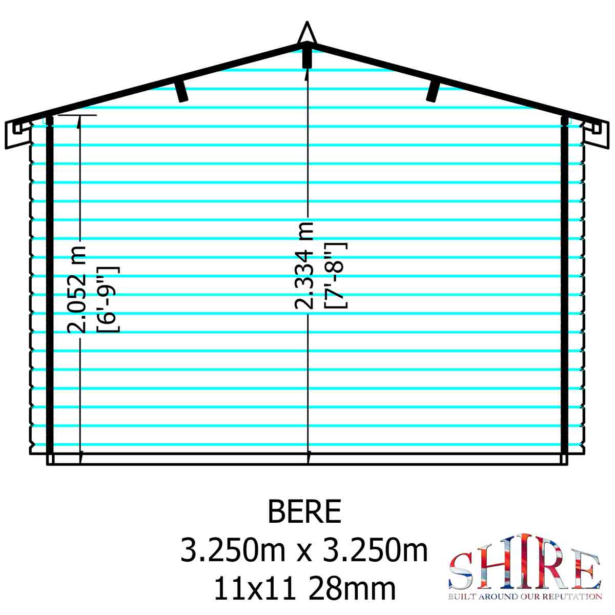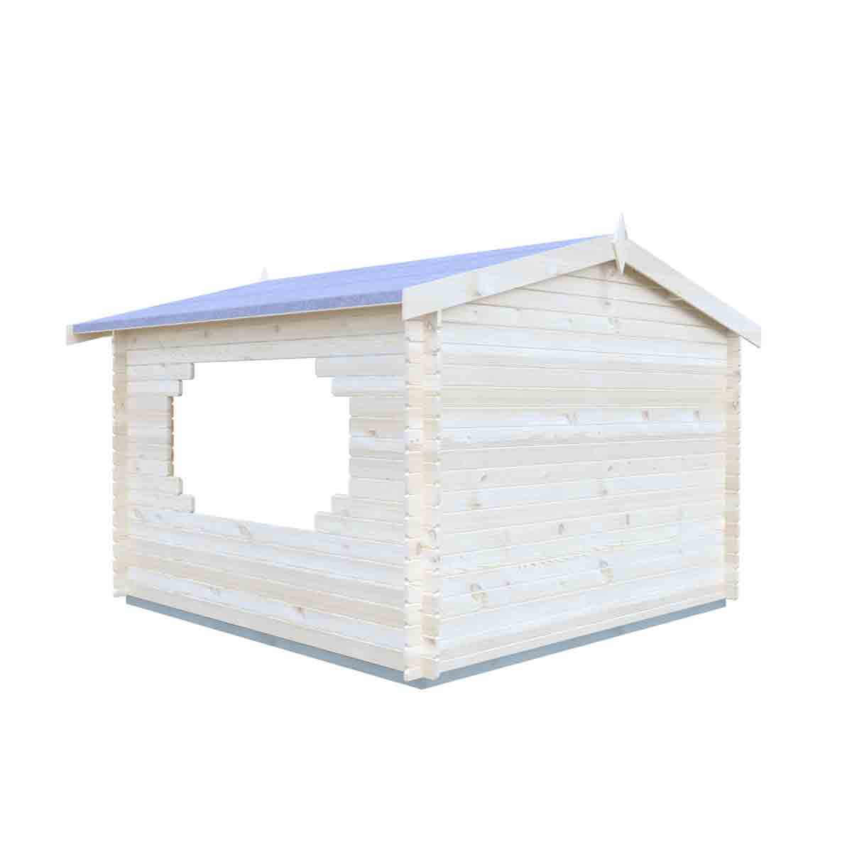 Assembly: Green mineral roof felt and the base frame are provided along with assembly instructions. Shire log cabins are supplied as individual log boards that require length by length assembly, building upwards. Building dimensions are to the edge of the individual boards that make up the unit and will include the crossover of the logs. The Bere Log Cabin is not supplied with a floor, so before you assemble your building, you will need to create a base which is flat and level to a sufficient size. Grass, soil or gravel are not sufficient as they will move with the weight of a building. You should also make allowance for the roof overhang and for access around the outside during construction and subsequent treatment.
