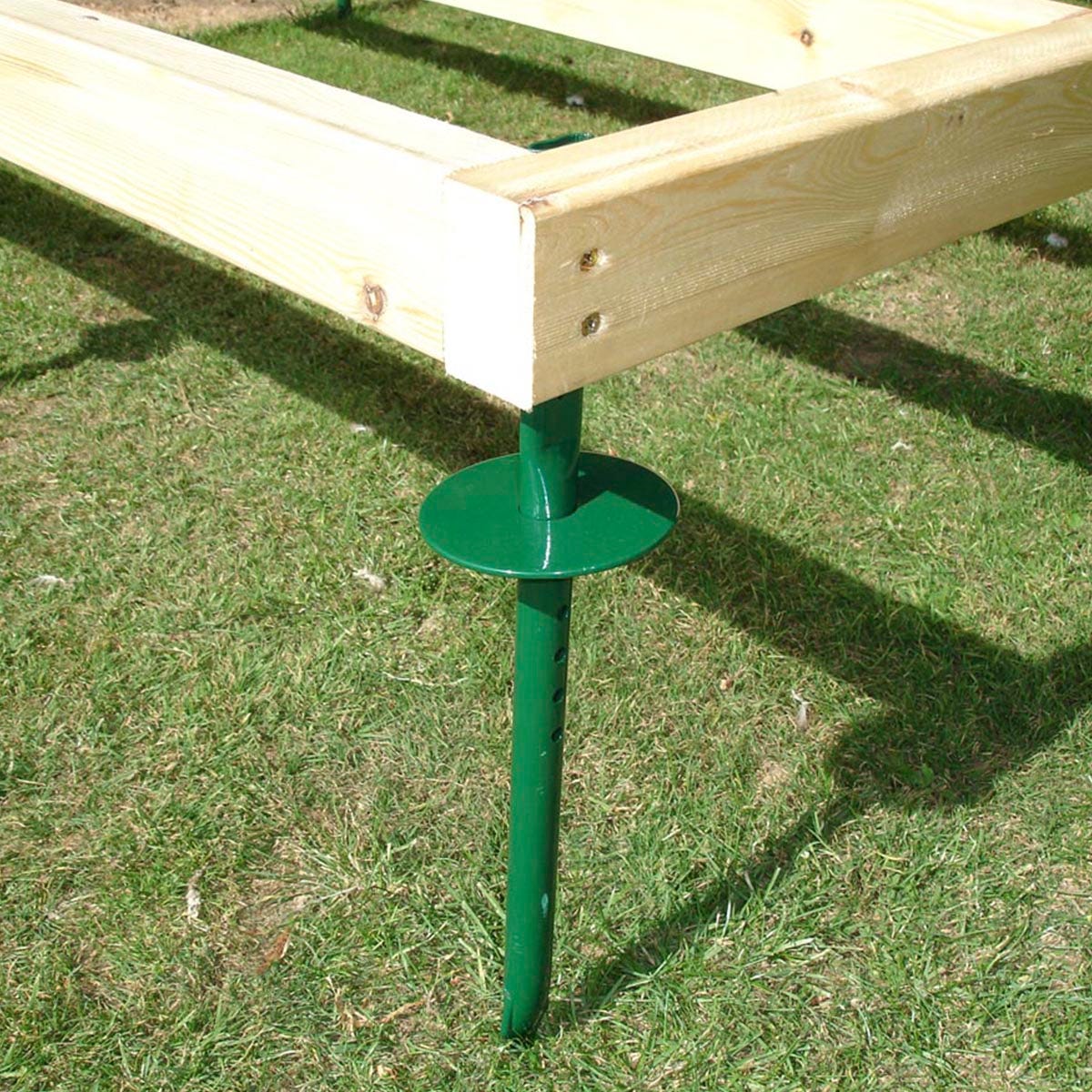 Simply assemble the bearers in the kit as directed and attach each of the adjustable legs. Provided the ground is not more than 100m out of level the difference can be adjusted by moving the sliding discs on the legs and then locking them into place as the base is progressively hammered into the ground. No digging and no concrete to mix.