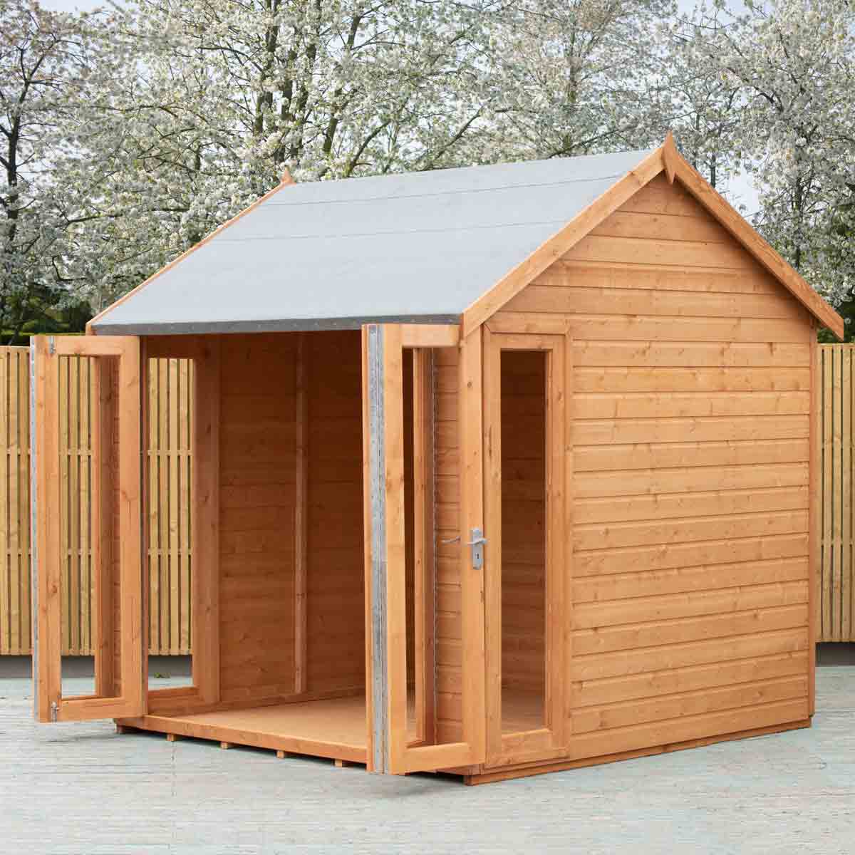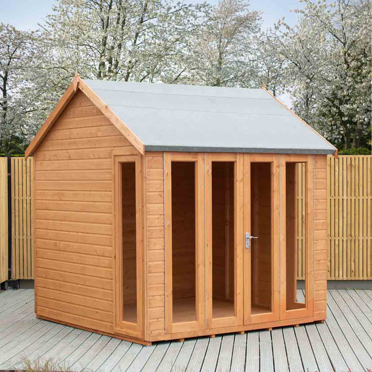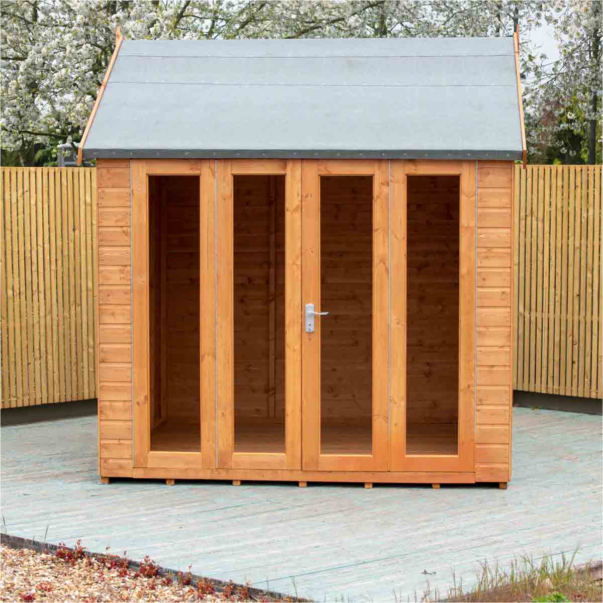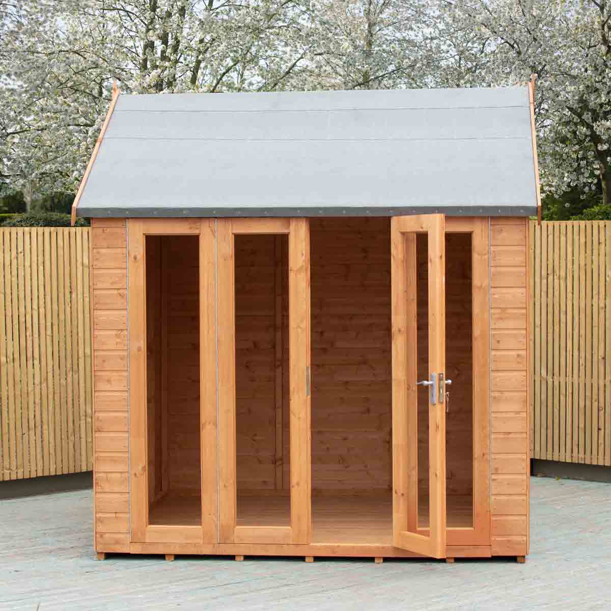 Proudly made in the UK, the Blenheim is a contemporary summerhouse featuring bi-fold doors across the front of the building. For the safety of you and your family, this garden room is glazed with styrene safety glazing. To complement the fully glazed front there are two fixed side windows.