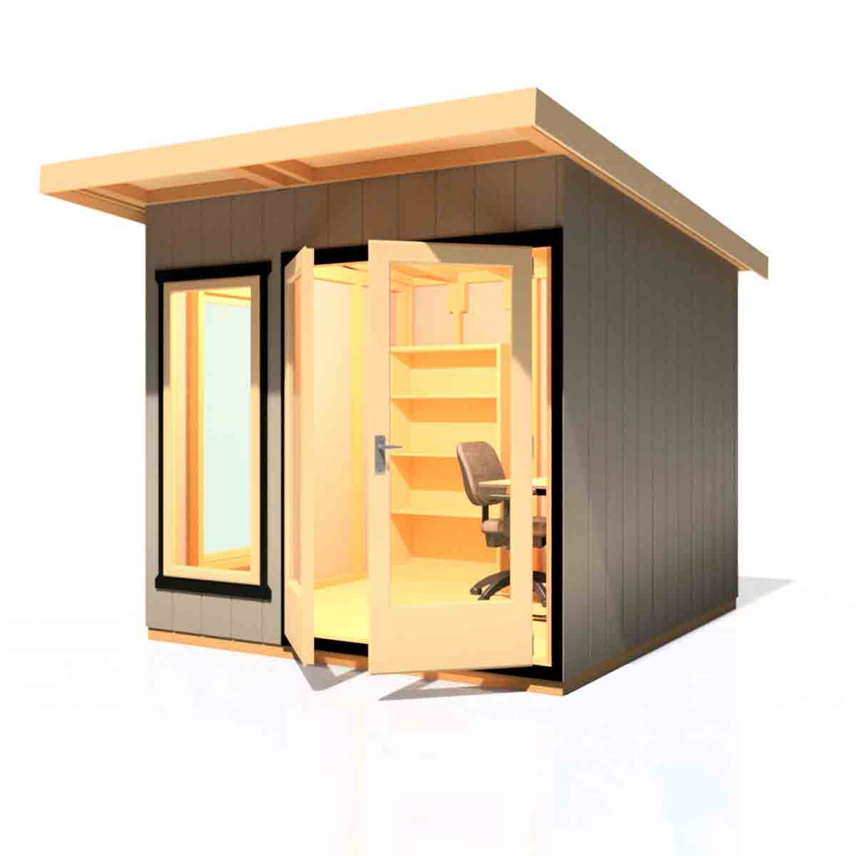 The door has a three-lever lock and in the summer you can work with the double door thrown wide open to enjoy the birdsong. All windows are opening. The construction itself is as impressive as it looks. The external cladding is an engineered wood board resistant to moisture, each wood strand is individually treated with advanced binders and wax. Each panel is treated throughout with our proprietary zinc borate-based process to help resist fungal decay and insect damage.