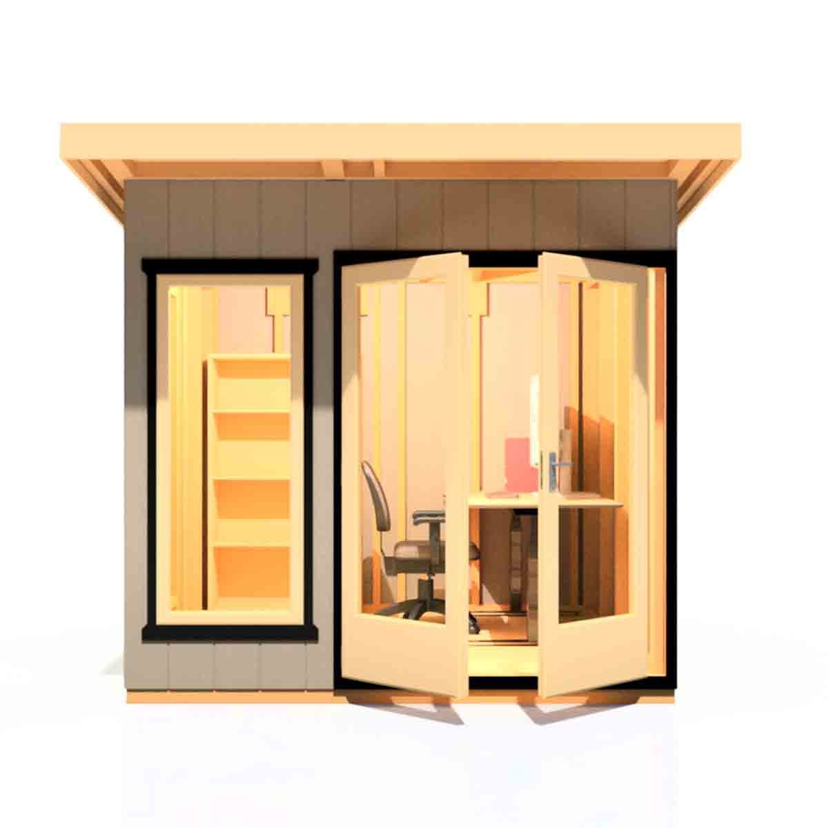 The internal wall and roof insulation consists of YBS Airtec Double, a highly reflective aluminium foil with a durable laminated surface on either side of an air bubble membrane which effectively acts as a Vapour Control. This has an R-Value of 1.45. There is a lovely choice of paint colours which will ensure your new office will be the envy of your neighbours! The Cali Home Office is an investment for your home and ideal whether working or as an all-year-around extra room. Please see the plan drawing for detailed dimensions. When siting, allowance should be made for the roof overhang and for access around the outside during construction and subsequent treatment.