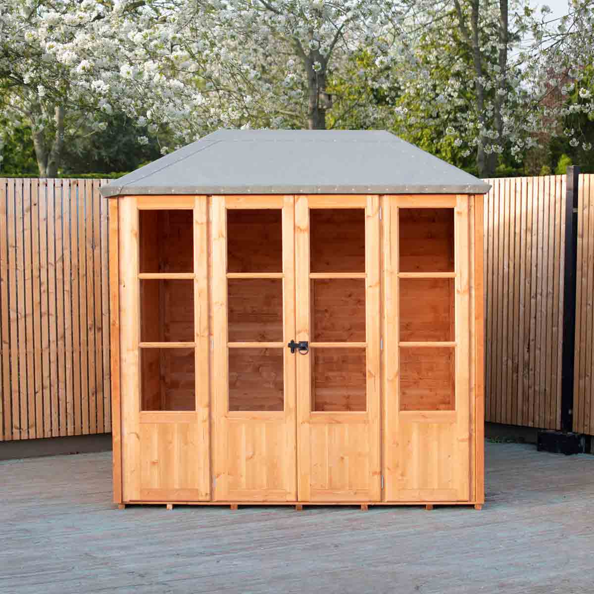 The roof is solid sheet OSB board and floor is 12 mm matching T&G. The summer house is supplied with a dip treated base coat preservative ready for you to top coat to your own preference immediately on installation. The windows and doors are joinery made quality and of a storm resistant design. All fixings, mineral roof felt and assembly instructions are provided. Allowance when siting should be made for the roof overhang and access for painting and during installation.
