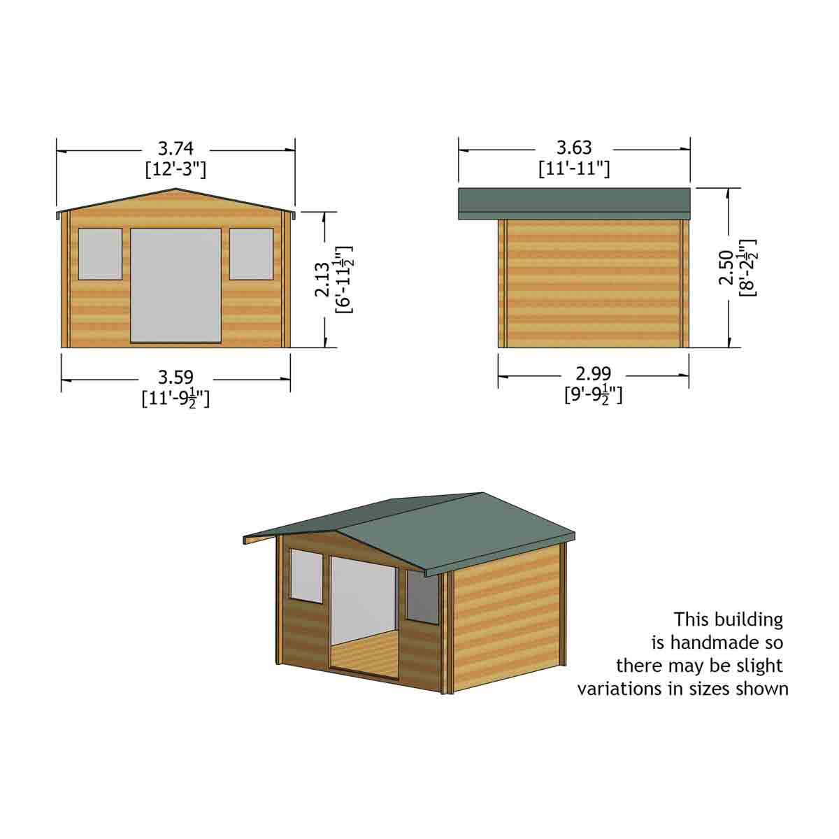 The roof and floor are 15 mm T&G with the floor also including pressure treated bearers. The interlocking timbers that make up the walls of the building are an impressive 28 mm thick. Internal eaves height is 6'10 / 2.086 m for a really spacious interior. The building is supplied untreated ready for you to paint or stain immediately after assembly with a good quality wood paint or stain. Where dimensions are critical please check internal (floor) sizes as building dimensions are to the external edge of the individual boards that make up the cabin and will include the crossover of the logs.