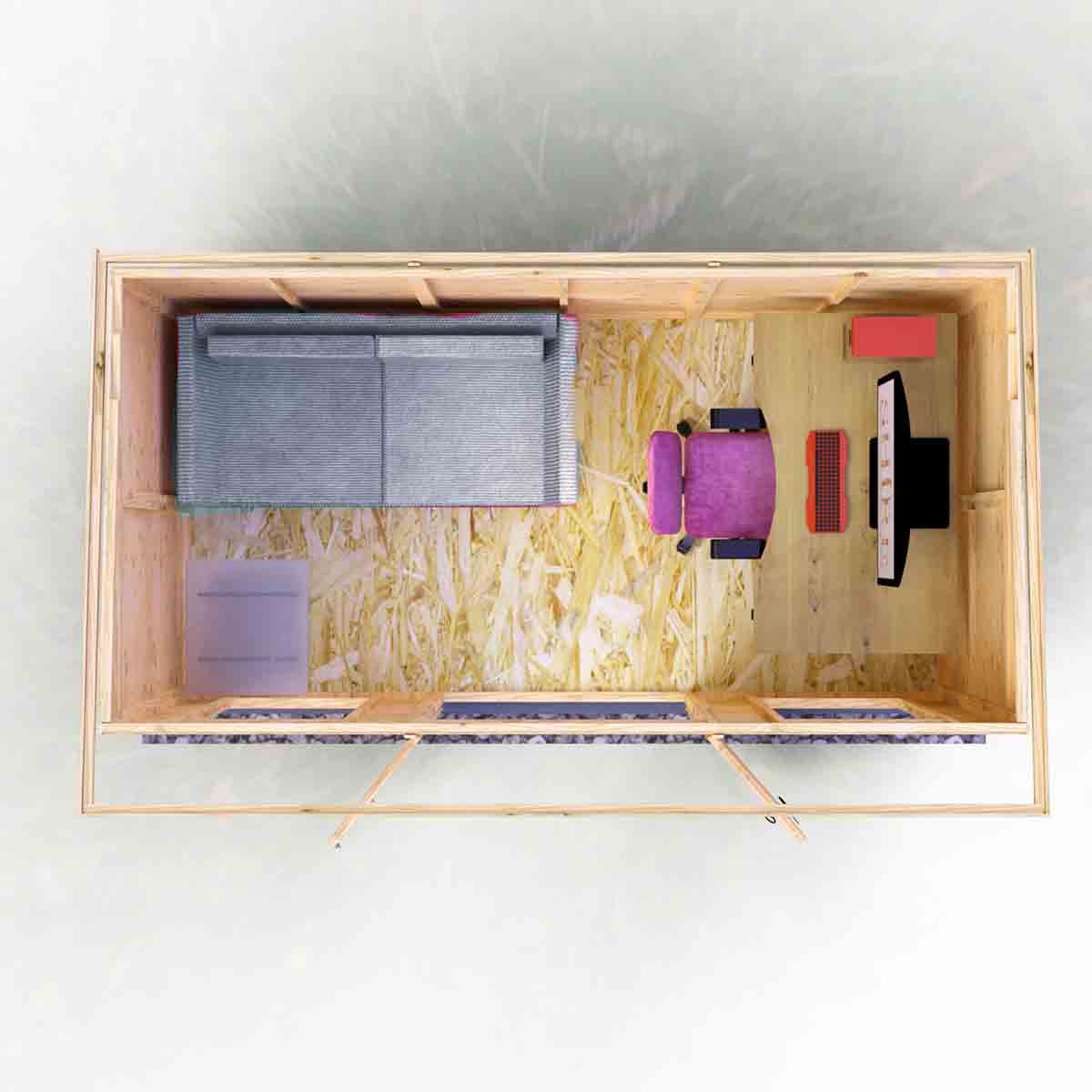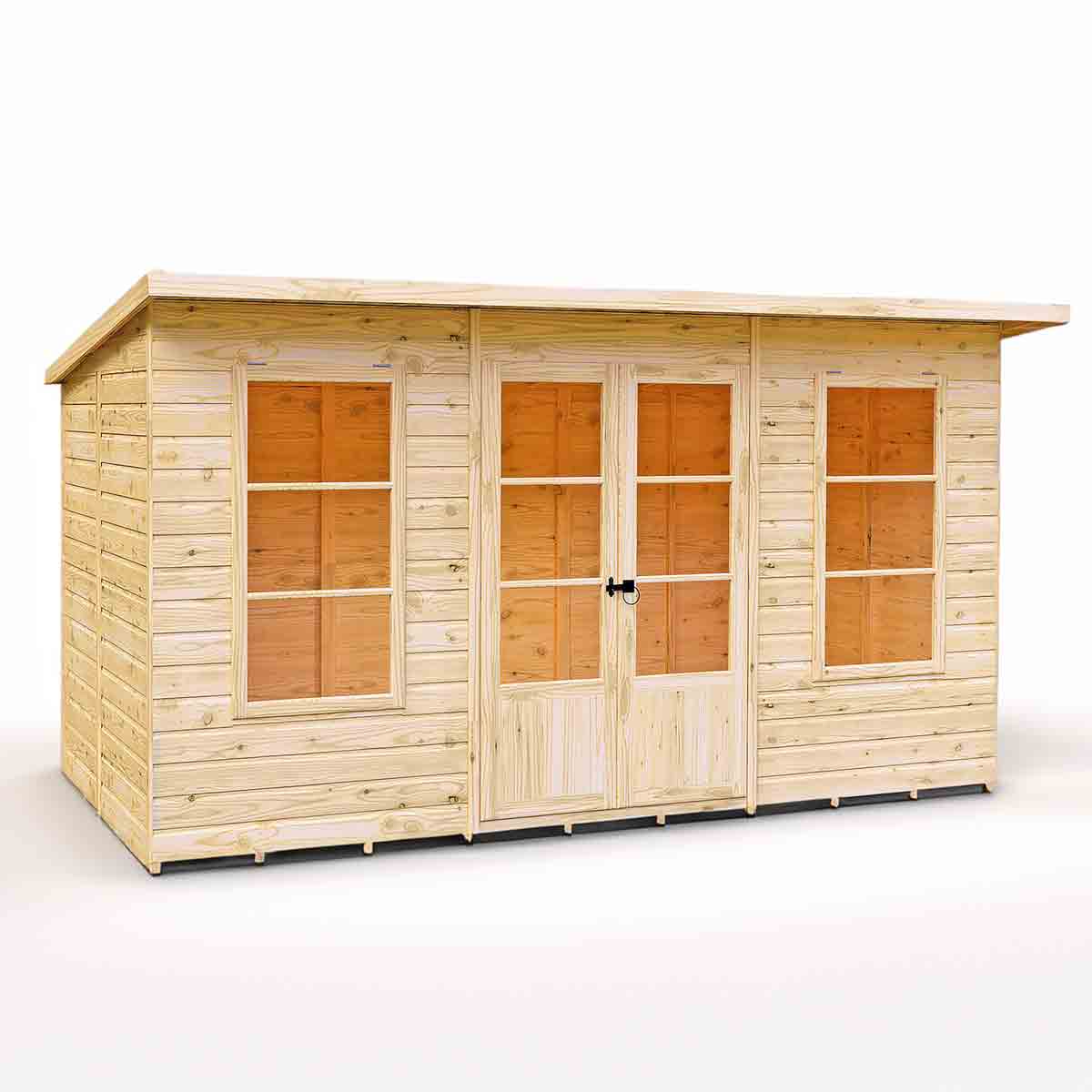 The Dahlia Summerhouse is complete with acrylic safety glazing with a window bar feature. Two opening windows are included to provide a welcome breeze. Double doors, featuring engineered timber doors to prevent risk of warping, provide excellent access for furniture. This lovely pent roof garden room is constructed from high grade shiplap cladding to the walls over 34mm strong framing with OSB floor and roof. Dipped base coat preservative ready for you to top coat.