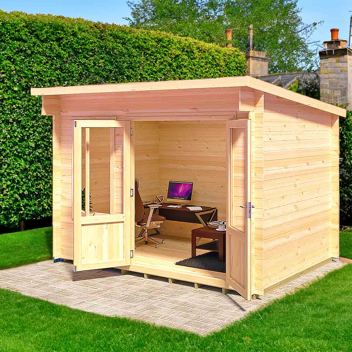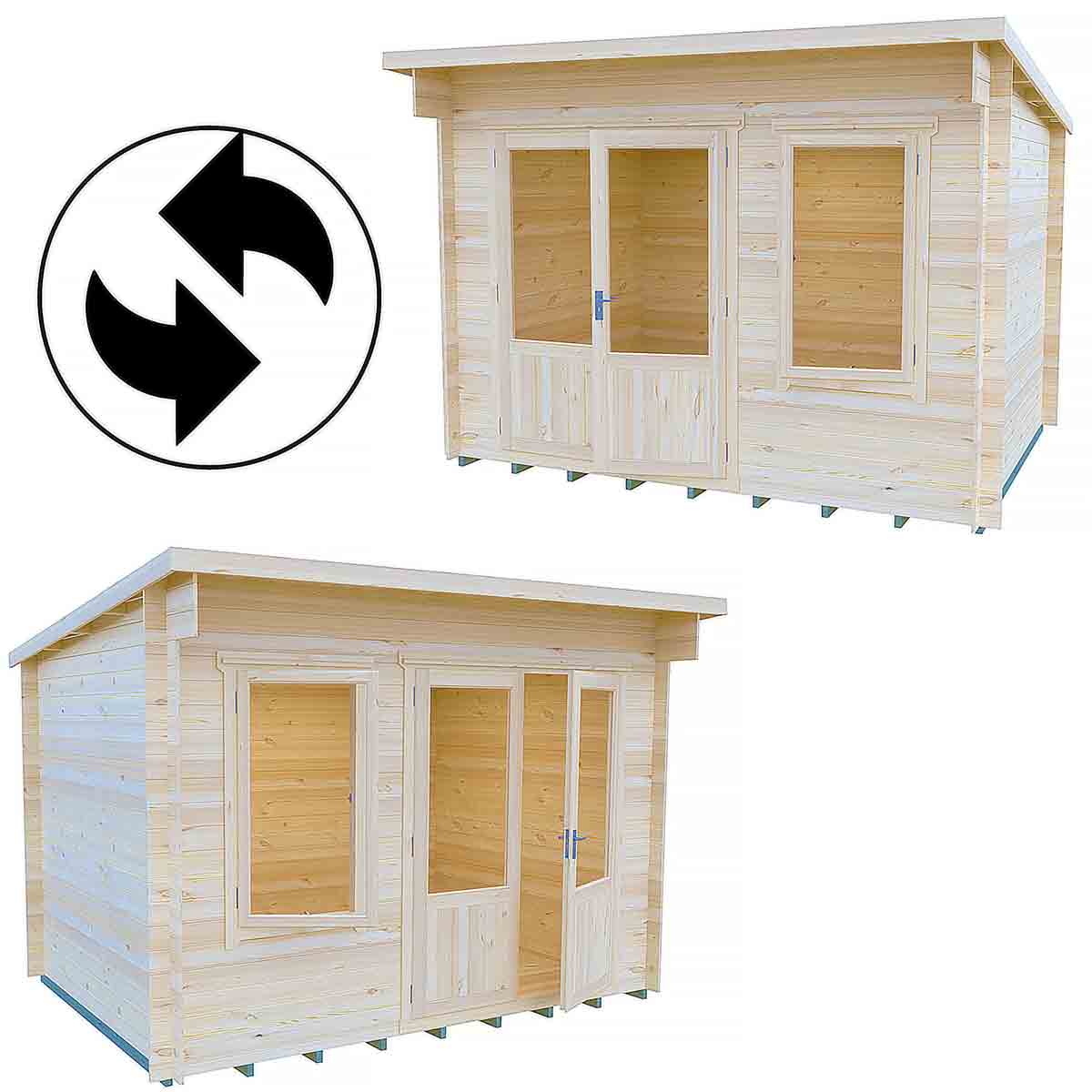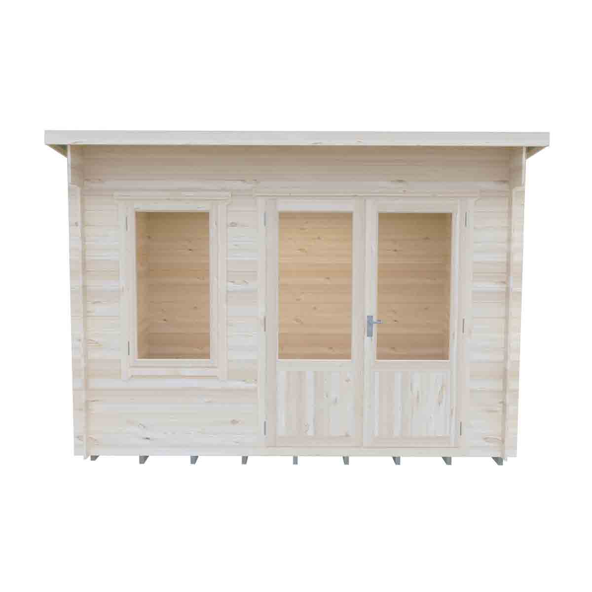 The cabin comes with a tongue and groove roof and floor with pressure treated bearers. The double door and opening window positions are interchangeable. The interlocking timbers that make up the walls of the building are 19mm thick, some 50% thicker than a normal garden building; roof and floor are 12mm thick.