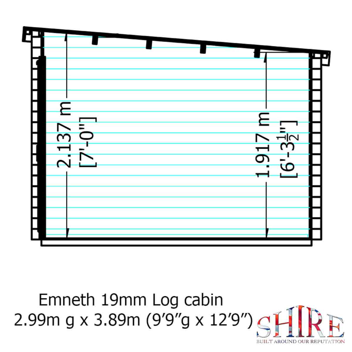 The cabin comes with a 12 mm tongue and groove roof and floor with pressure treated bearers. The building is supplied untreated ready for you to paint or stain immediately after assembly, this should be a good quality wood paint or stain. Where dimensions are critical please check internal (floor) sizes as building dimensions are to the external edge of the individual boards that make up the cabin and will include the crossover of the logs. Internal eaves height is over 6'3 (1917 mm) for a really spacious interior. Please note that log cabins are supplied as individual log boards that are assembled length by length, building up from the floor; not pre-made panels.