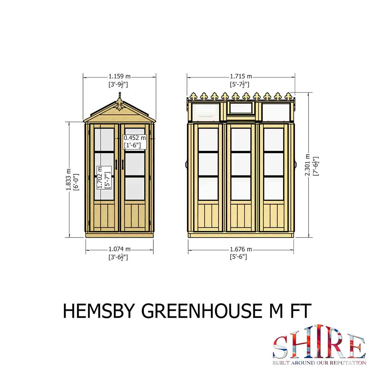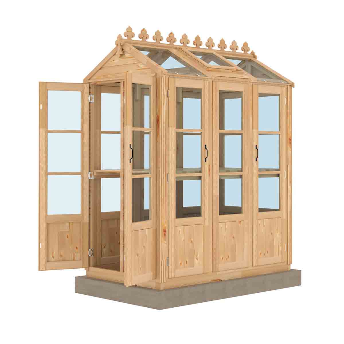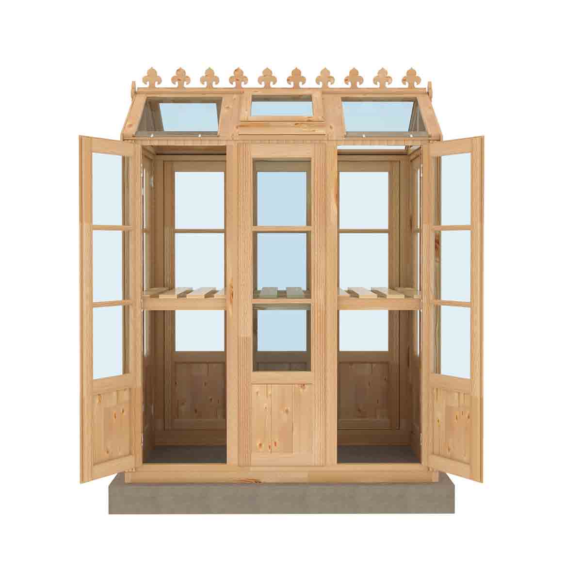 The greenhouse is glazed with toughened glass. Four doors are supplied, each door opening is 452 x 1702 and doors can be hung in any of the 10 spaces, if in each gable end, it gives the double door effect. Two roof windows are also included. As usual with a greenhouse, no floor is supplied and the greenhouse sits on a pressure treated base rail. Manufactured in high grade Northern European, certified timber and finished with a honey brown basecoat preservative treatment ready for your own top coat of wood paint or stain following assembly. All fixings and assembly instructions are provided. Imperial measurements are rounded so please refer to the metric sizes for accuracy.