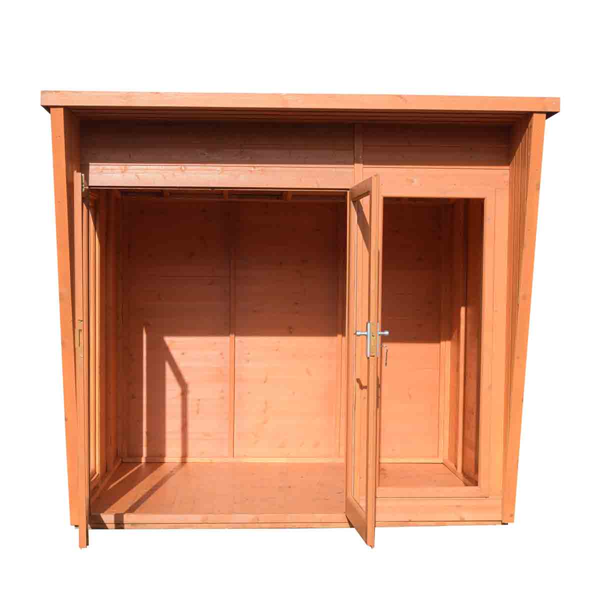 The high-quality double doors open out to the front with a small canopy over and there are large opening side windows. The windows and doors are fitted with styrene safety glazing and are joinery made in a storm-resistant design.