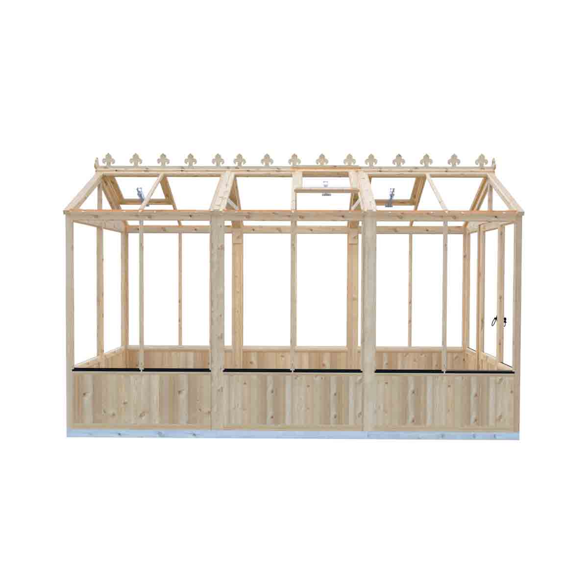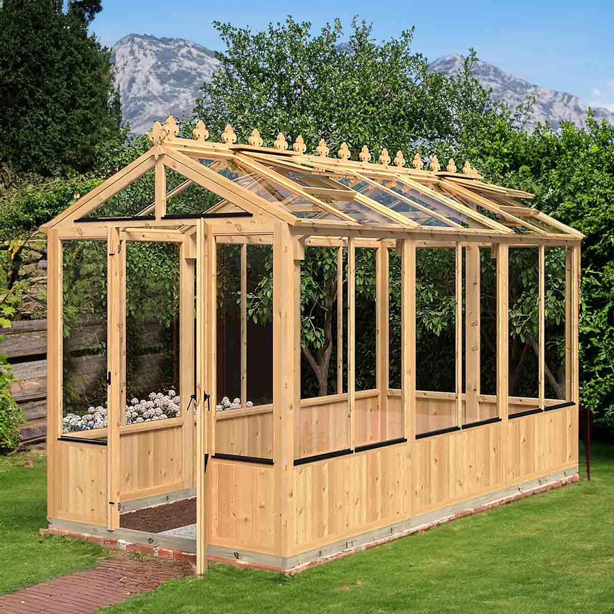 The Holkham is a stunning greenhouse available in a range of sizes to suit everyone. A wooden greenhouse has many advantages for gardeners and will also provide you with a relaxing environment to potter in. Featuring Shire's quality joinery and completed with an attractive finial and cresting to the roof, the Holkham is both practical as well as charming. The low wooden panels also add a very traditional detail to this lovely building. The greenhouse is glazed with toughened glass and has a single door with traditional gate latch handle. Roof windows have an automatic Bayliss opener supplied. The number of roof windows per model is, one in the 4 x 6, two in a 6 x 8, three in a 6 x 12 and four in a 6 x 16. As usual with a greenhouse, no floor is supplied and the greenhouse sits on a pressure treated base rail. Manufactured in the UK from high grade Northern European, timber and finished with a honey brown basecoat preservative treatment ready for your own top coat of wood paint or stain following assembly. All fixings and assembly instructions are provided. Imperial measurements are rounded so please refer to the metric sizes for accuracy. Allowance should be made for the roof overhang and for access around the outside during construction and subsequent treatment. Following your order, you will be sent a link to choose your delivery day. On the morning of delivery you will also receive live tracking information. Before you assemble your greenhouse , you will need a base which is flat and level to a sufficient size. Grass, soil or gravel are not sufficient as they will move with the weight of a building.