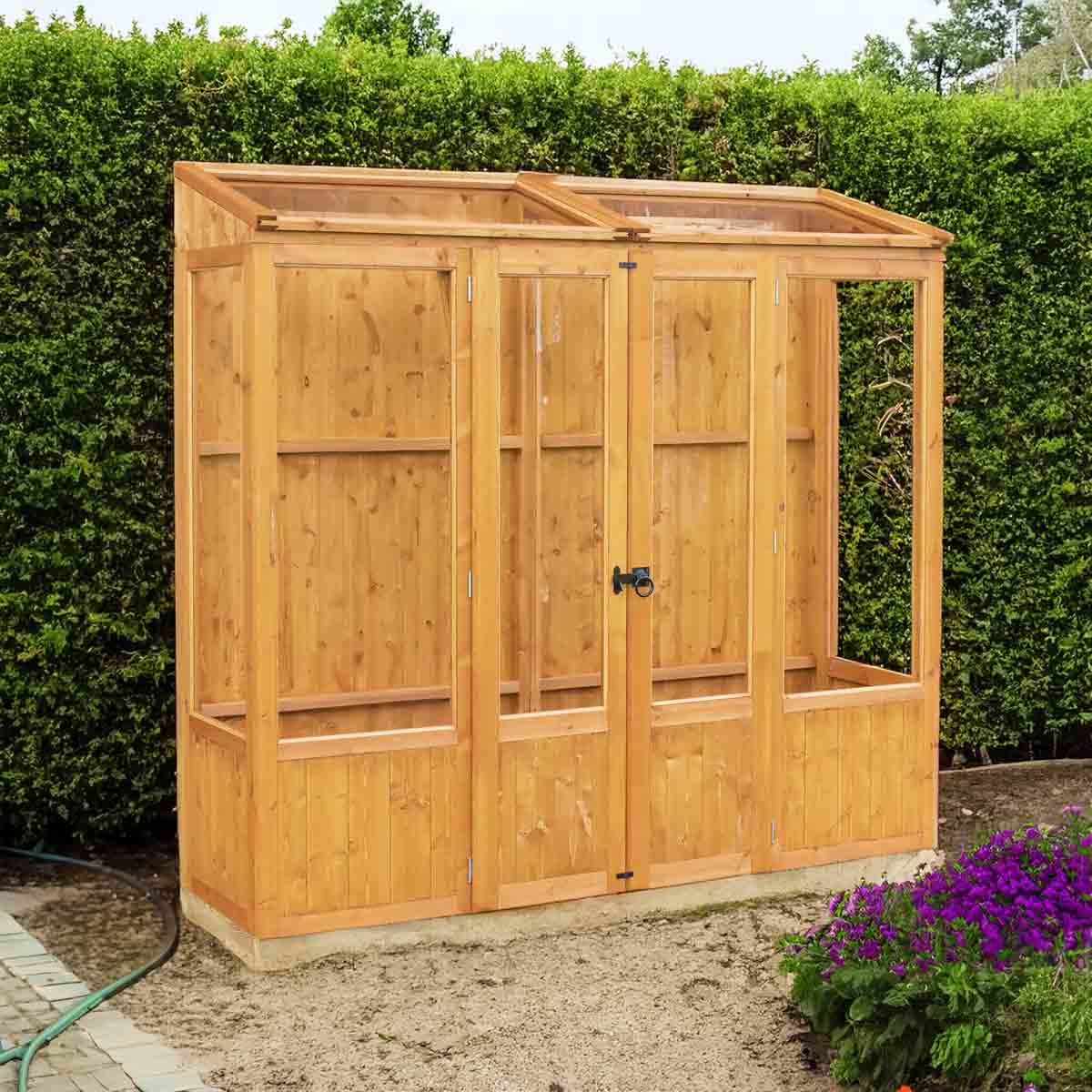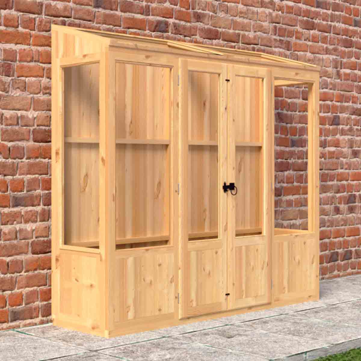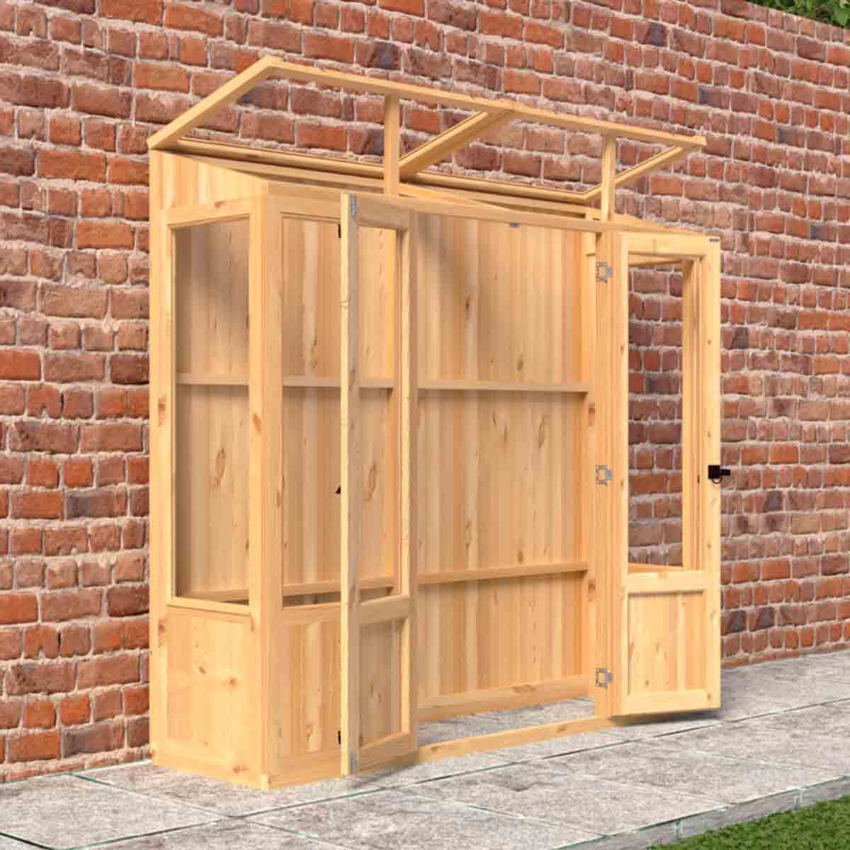 The Holme is a very practical lean to greenhouse which will provide all the advantages of a timber greenhouse in a compact size to suit many locations. The low wooden T&G panels add a very traditional detail to this functional design. The Holme will make a feature of a plain wall as well as being a great asset if you "Grow Your Own". The greenhouse is glazed with toughened glass and has a double door for easy access, fitted with a traditional gate latch handle. The roof can be opened on a hot day to provide excellent ventilation. As usual with a greenhouse, no floor is supplied and the greenhouse sits on a pressure treated base rail. Manufactured in the UK from high grade Northern European, timber and finished with a honey brown basecoat preservative treatment ready for your own top coat of wood paint or stain following assembly. All fixings and assembly instructions are provided. Imperial measurements are rounded so please refer to the metric sizes for accuracy. Allowance should be made for the roof overhang and for access around the outside during construction and subsequent treatment. Following your order, you will be sent a link to choose your delivery day. On the morning of delivery you will also receive live tracking information. Before you assemble your greenhouse , you will need a base which is flat and level to a sufficient size. Grass, soil or gravel are not sufficient as they will move with the weight of a building.