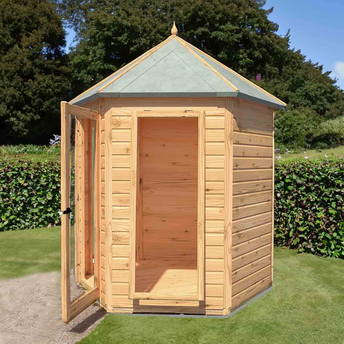 The hexagonal shaped Kendall Summerhouse gives you a lovely space to sit and enjoy the garden. This pretty feature summer house is constructed on 34mm square framing and clad with planed Shiplap tongue and groove boards made only from the highest grade, slow grown, approved, northern European pine. The roof and floor are tongued and grooved timber. Completed with acrylic safety glazing and one opening window. Dipped base coat preservative ready for you to top coat.