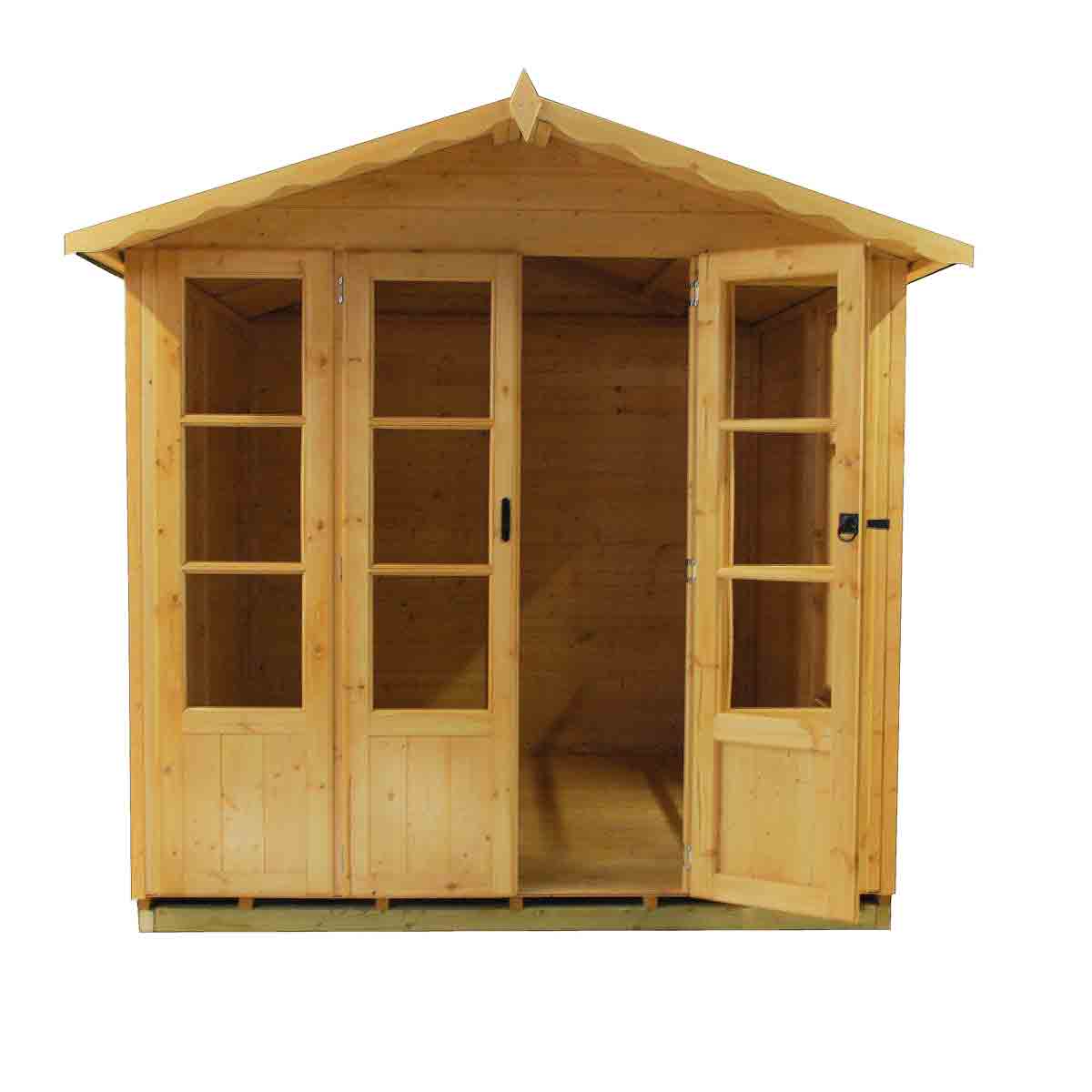 The high-quality double doors open out to the front and the large attractive opening side window can go on either side. It is constructed on 34mm square framing and clad with planed shiplap tongue and groove boards made only from the highest grade, slow grown, northern European pine.