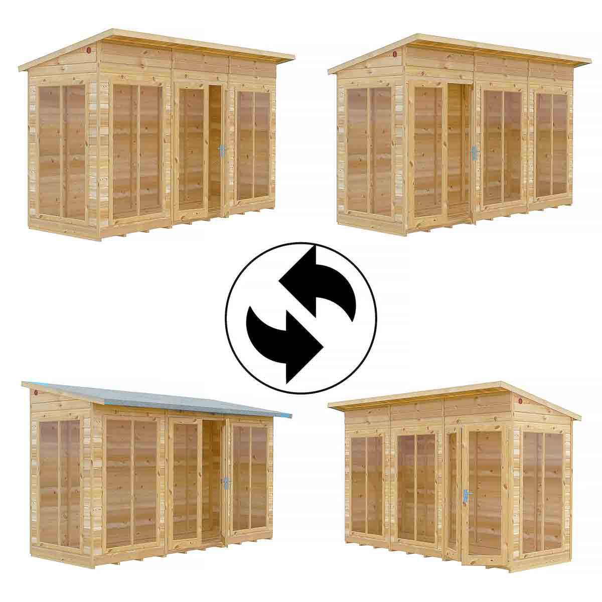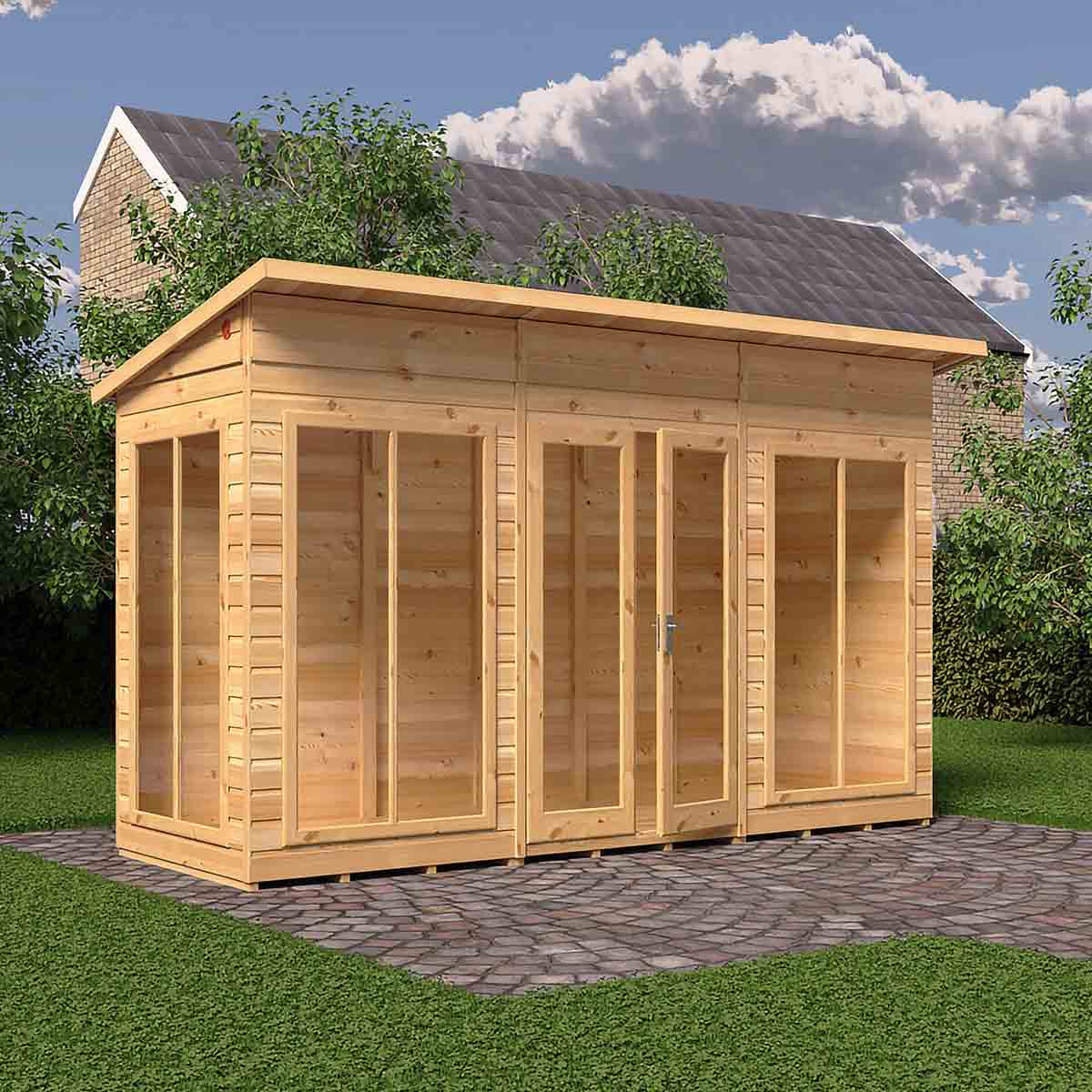 The stylish Lela Summerhouse is a valuable addition to your outdoor living - this modern garden room is perfect for summer dining and relaxing. With an eaves height of around 7 ft high, the Lela provides a very comfortable, spacious interior. The joinery made double doors are fitted with a mortice lock and, like the fixed windows, are glazed with styrene safety glazing. The building is constructed on mighty 44mm square framing and clad with planed shiplap tongue and groove boards made only from the highest grade, slow grown, slow grown pine. The floor and roof are 12mm matching T&G boards and the roof comes with mineral felt supplied. The summerhouse is supplied with a honey brown dip treated base coat preservative ready for you to top coat to your choice immediately on installation; this could be a paint or a stain. Our picture illustrates what can be achieved with decoration. When siting, allowance should be made for the roof overhang and access for painting and during installation. If factory installation is selected: Your building will be delivered and installed onto your prepared site. This needs to be flat and level to a sufficient size. Grass, soil or gravel are not sufficient as they will move with the weight of a building. Following your order, you will be sent a link to choose your delivery day. On the morning of delivery day you will also receive live tracking information. Before you assemble your building, you will need a base which is flat and level to a sufficient size. Grass, soil or gravel are not sufficient as they will move with the weight of a building.