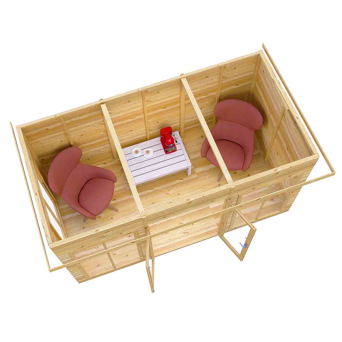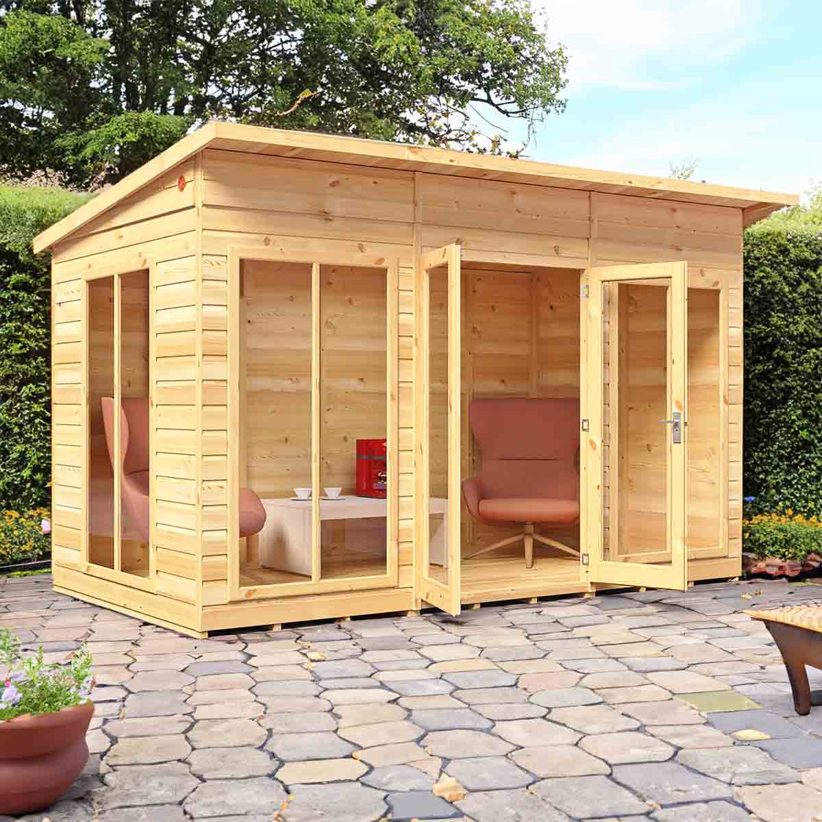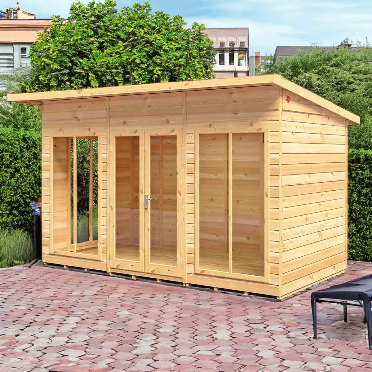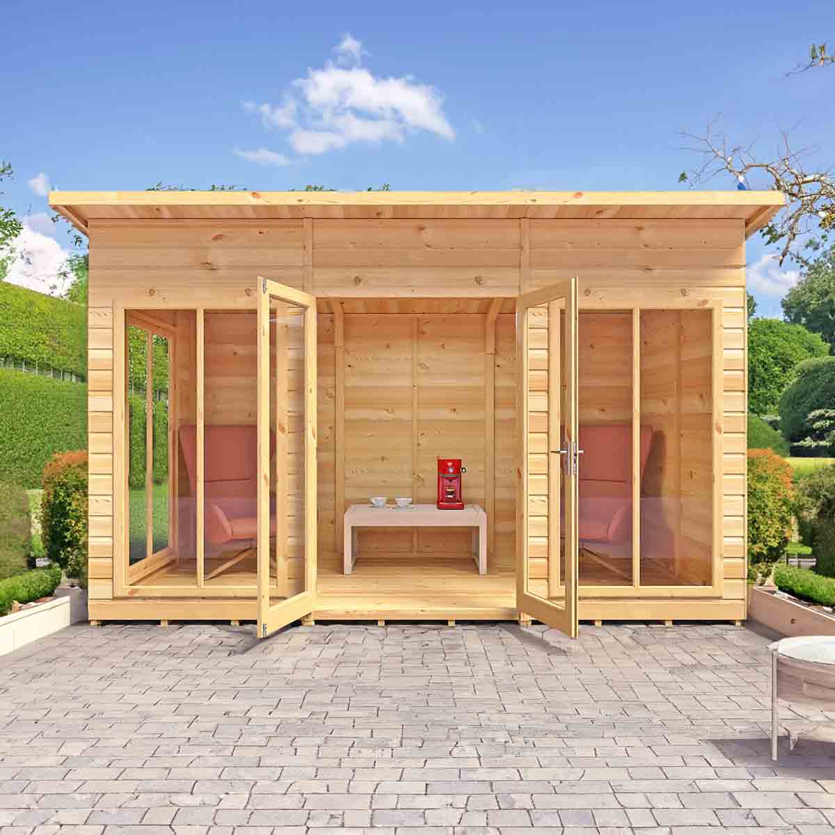 The stylish Lela Summerhouse is a valuable addition to your outdoor living - this modern garden room is perfect for summer dining and relaxing. With an eaves height of around 7 ft high, the Lela provides a very comfortable, spacious interior. The joinery made double doors are fitted with a mortice lock and, like the fixed windows, are glazed with styrene safety glazing. The building is constructed on mighty 44mm square framing and clad with planed shiplap tongue and groove boards made only from the highest grade, slow grown, slow grown pine. The floor and roof are 12mm matching T&G boards and the roof comes with mineral felt supplied. The summerhouse is supplied with a honey brown dip treated base coat preservative ready for you to top coat to your choice immediately on installation; this could be a paint or a stain. Our picture illustrates what can be achieved with decoration. When siting, allowance should be made for the roof overhang and access for painting and during installation. If factory installation is selected: Your building will be delivered and installed onto your prepared site. This needs to be flat and level to a sufficient size. Grass, soil or gravel are not sufficient as they will move with the weight of a building. Following your order, you will be sent a link to choose your delivery day. On the morning of delivery day you will also receive live tracking information. Before you assemble your building, you will need a base which is flat and level to a sufficient size. Grass, soil or gravel are not sufficient as they will move with the weight of a building.