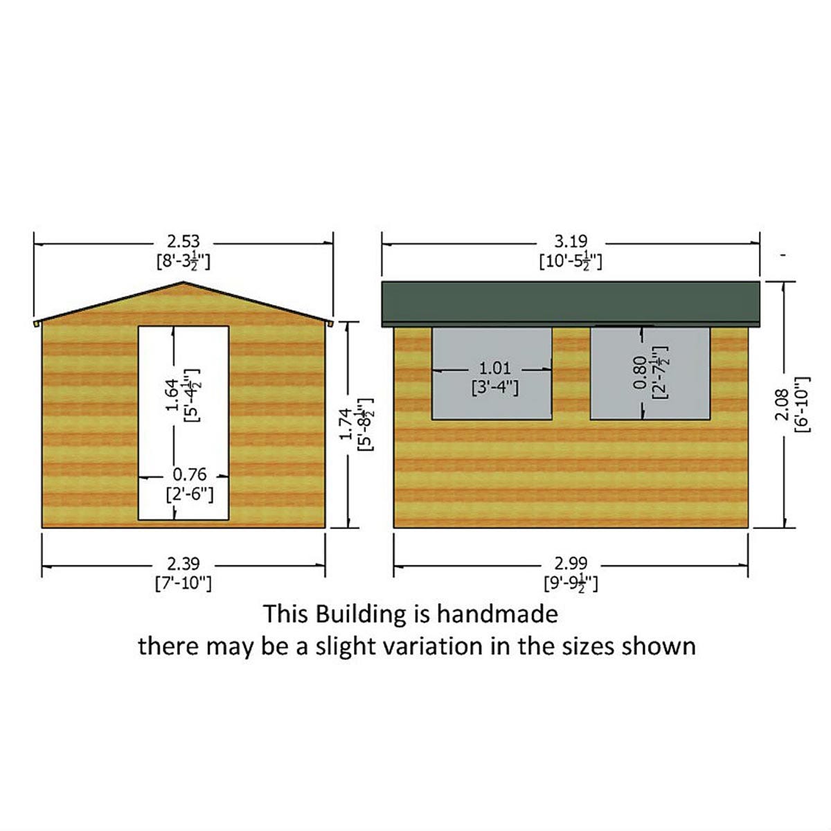 Roof felt and all necessary fixings are supplied, and the shed comes flat packed with a full set of installation instructions. Dimensions shown are for the exterior wall of the building. (Imperial measurements are rounded so please refer to the metric sizes for accuracy).