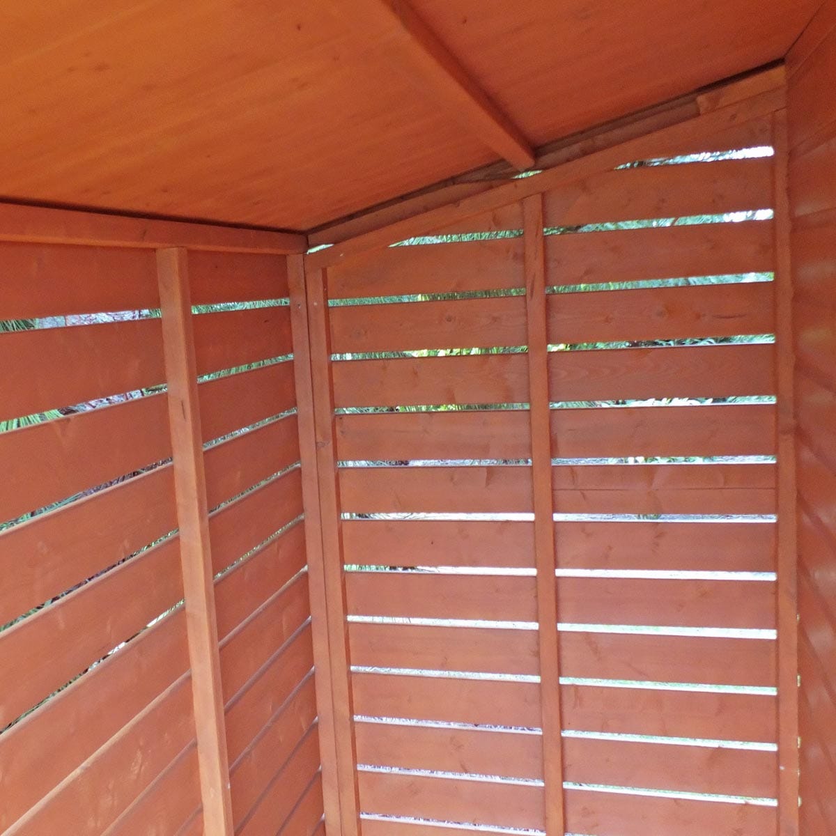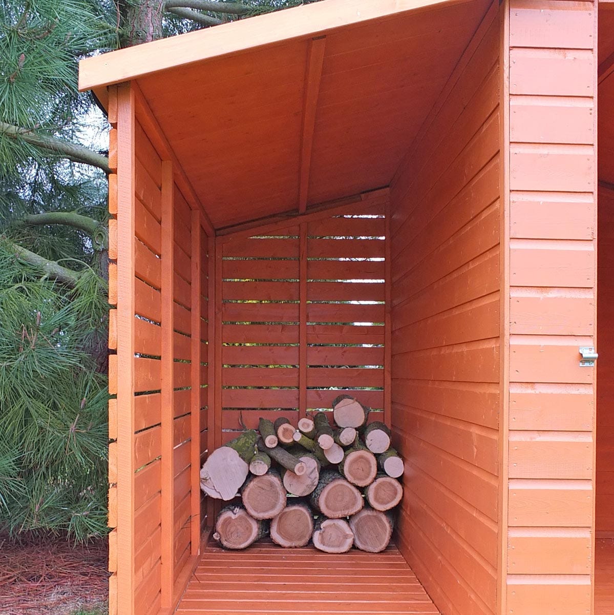 The log store is made to the same high specification as the shed but has slatted walls to promote airflow around the logs to allow drying.
