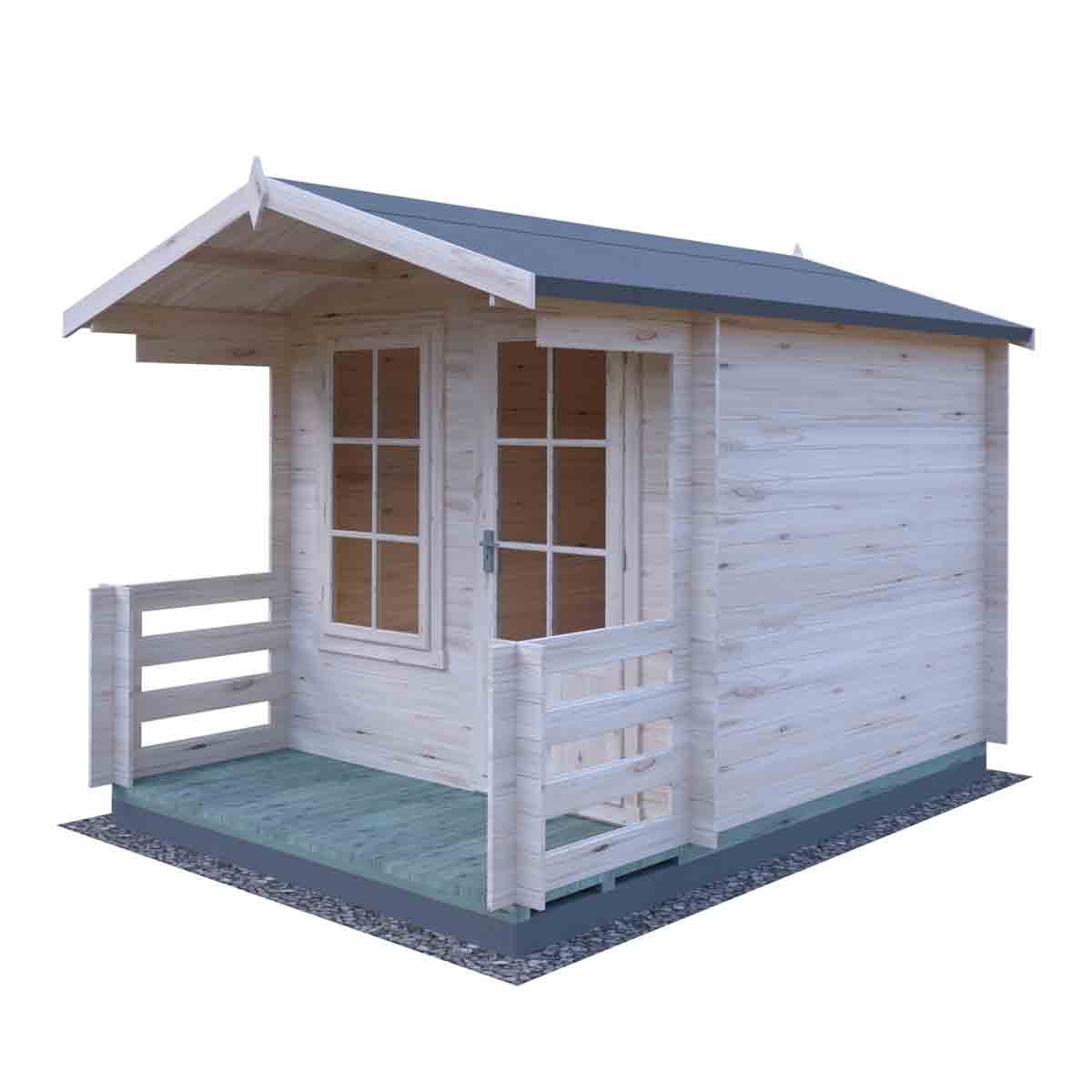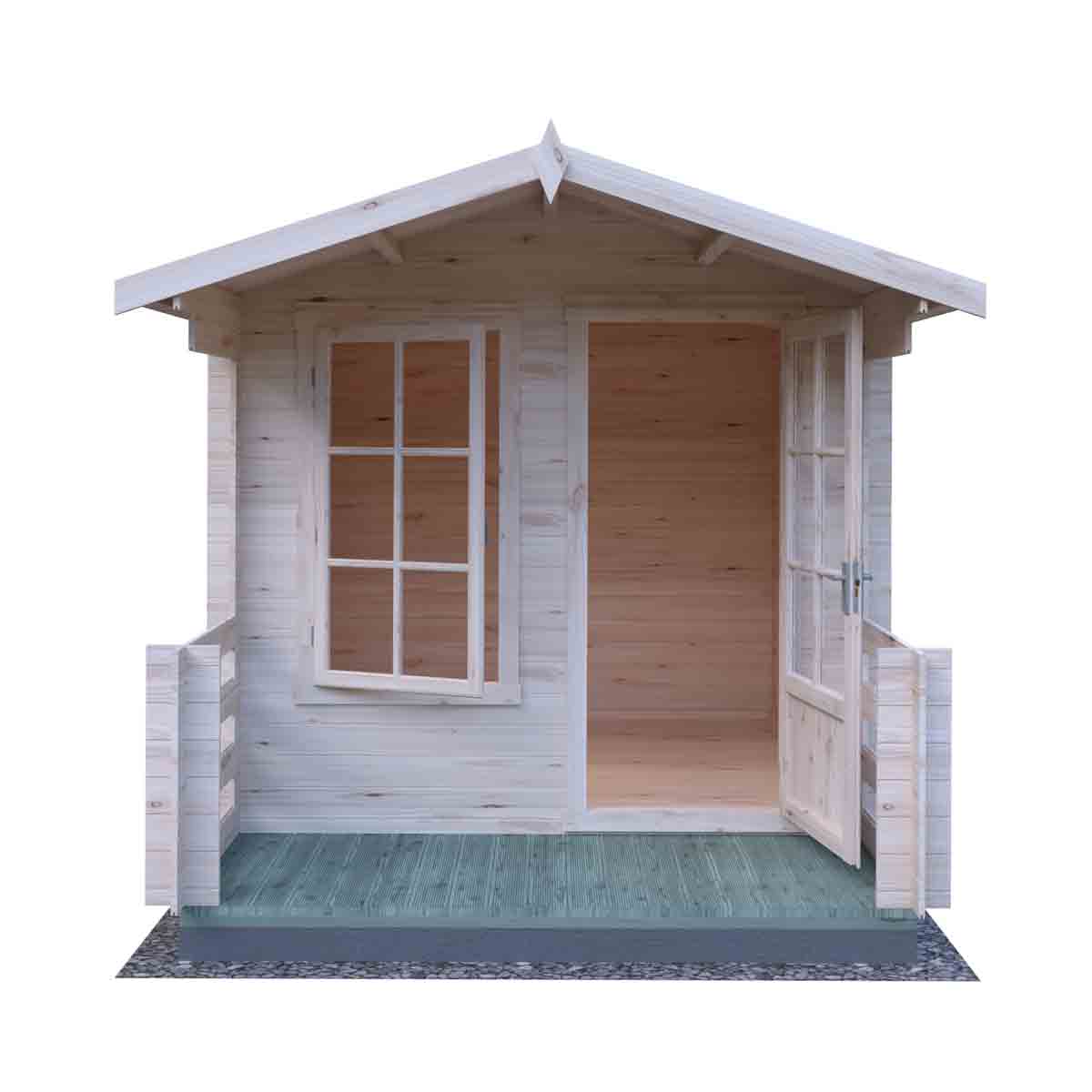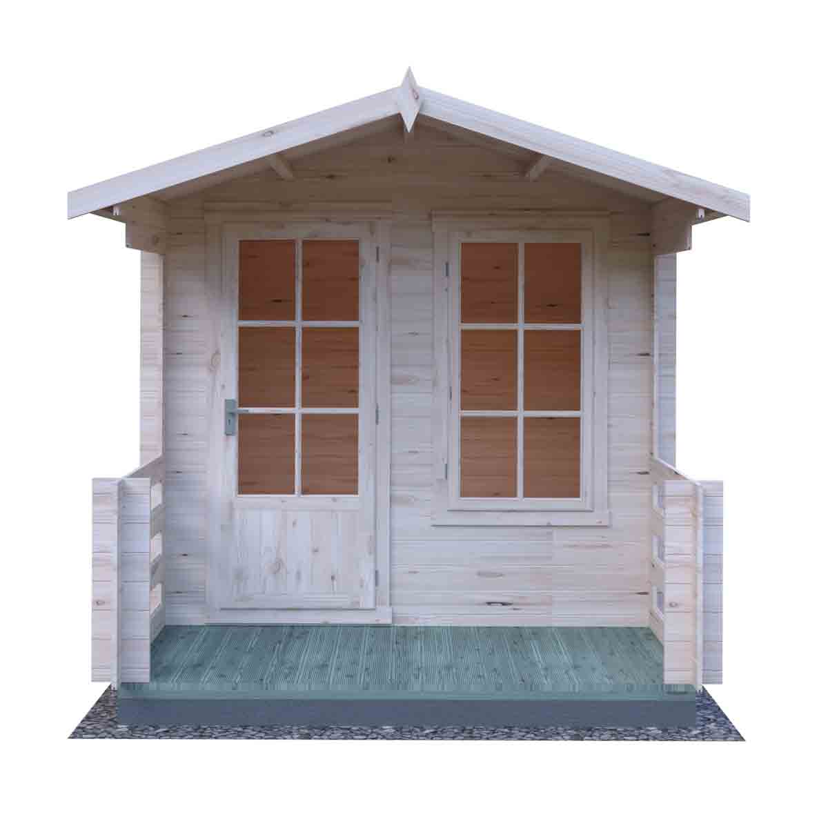 The 8’ x 8’ Maulden log cabin is an attractive addition to any garden, the high-quality Georgian window and door together with decked terrace give you a great garden building. This top-quality log cabin has 19mm interlocking high grade pine boards to the walls with tongue and groove boards to roof and floor.