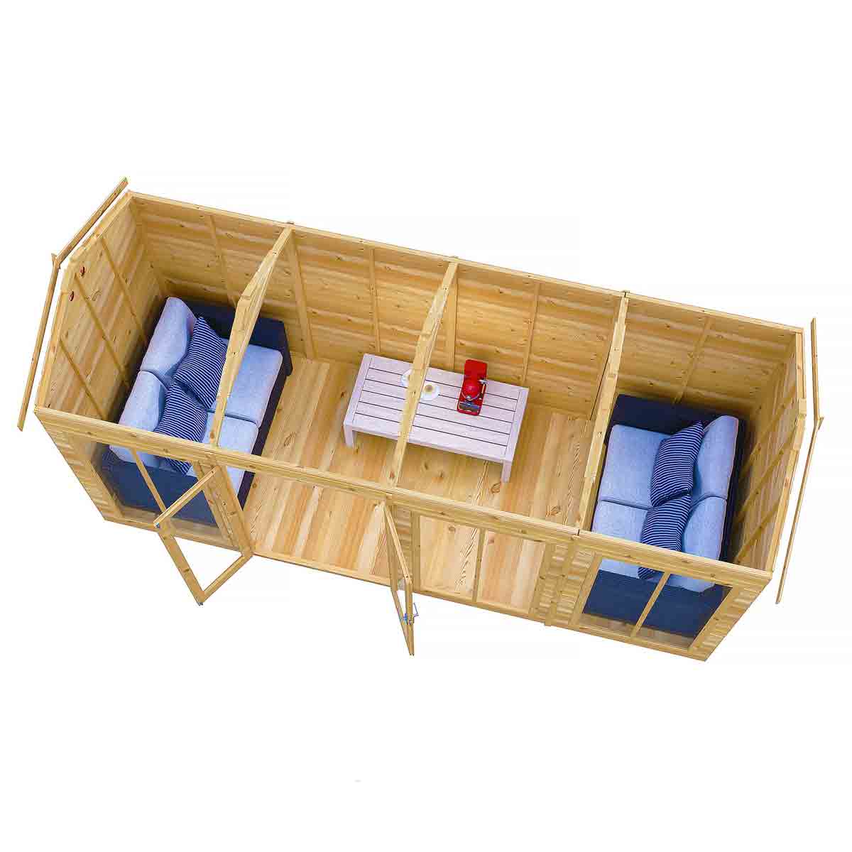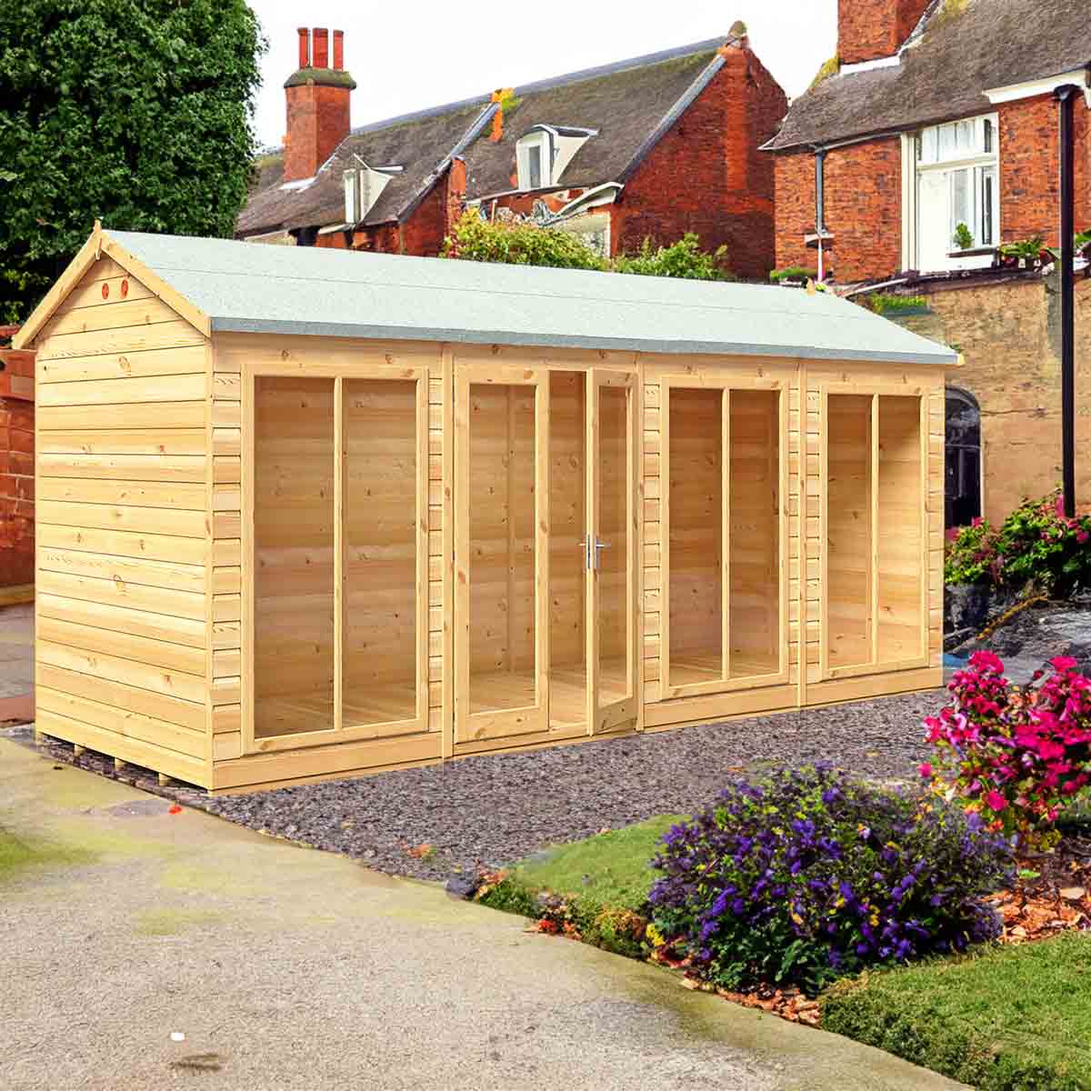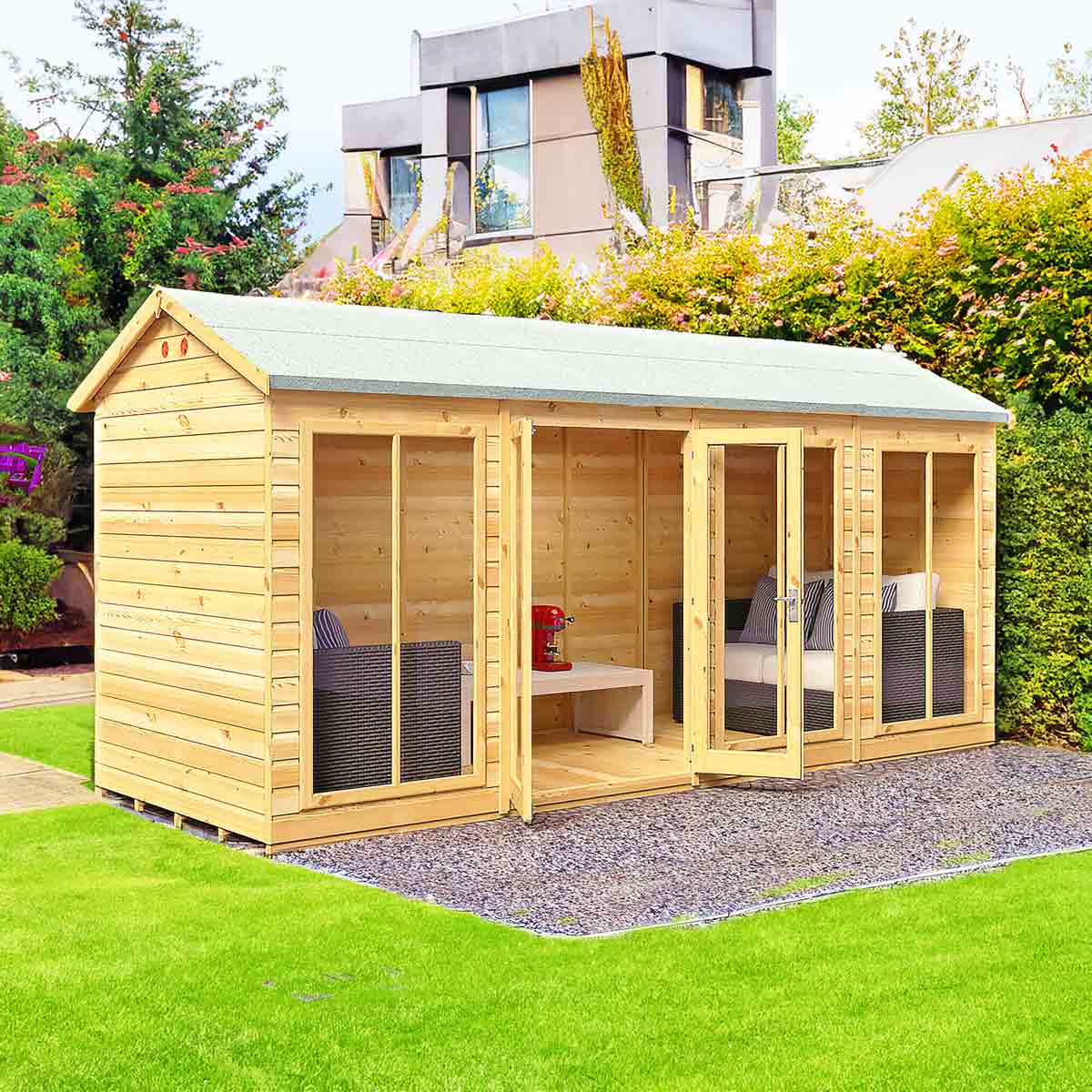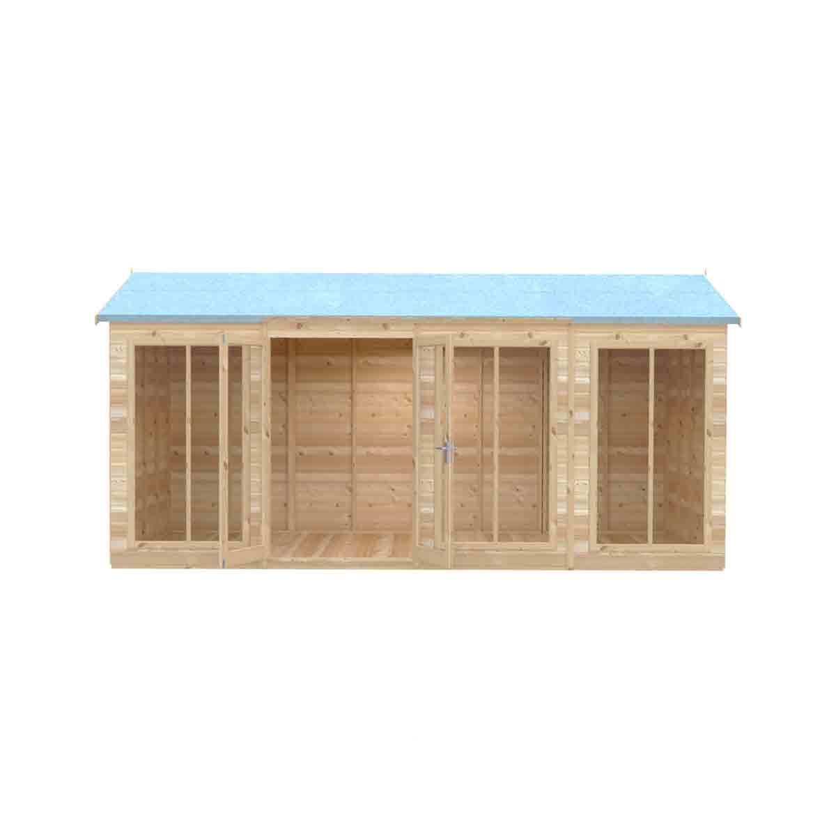 The Mayfield is a stunning summerhouse with the fully glazed front providing lots of natural light, the glazing is acrylic for your safety. There are useful double doors giving easy access and these are also lockable. This lovely garden room is constructed from high grade 12 mm pine shiplap boards over sturdy 34 mm x 34mm framing. The floor and roof are 12 mm T&G with roof felt provided to complete the roof exterior. The modern design also allows for different window and door layouts to best suit your location. Dipped base coat preservative ready for you to top coat.