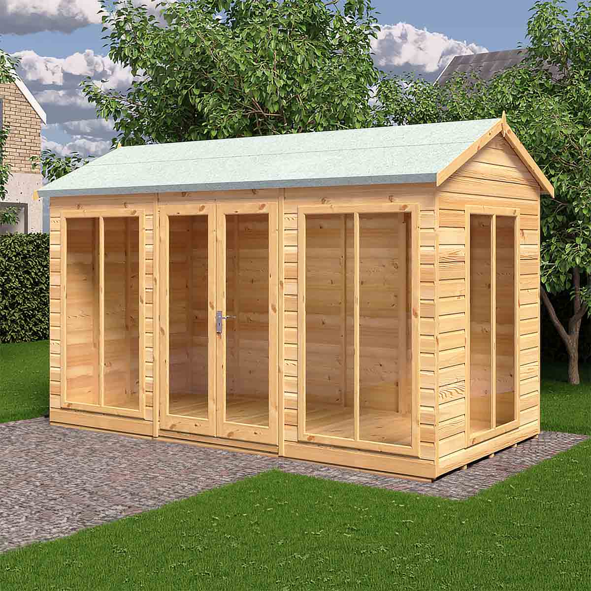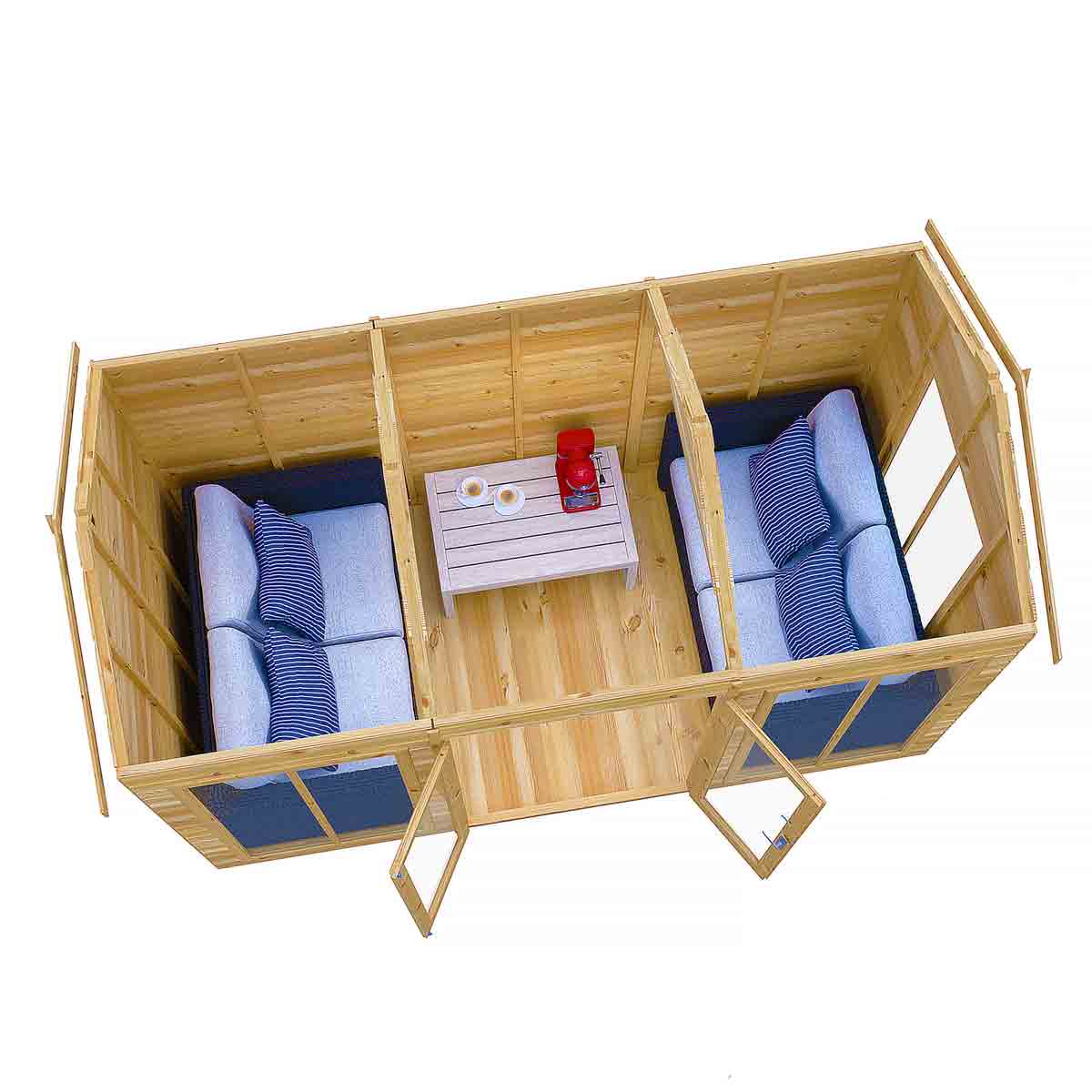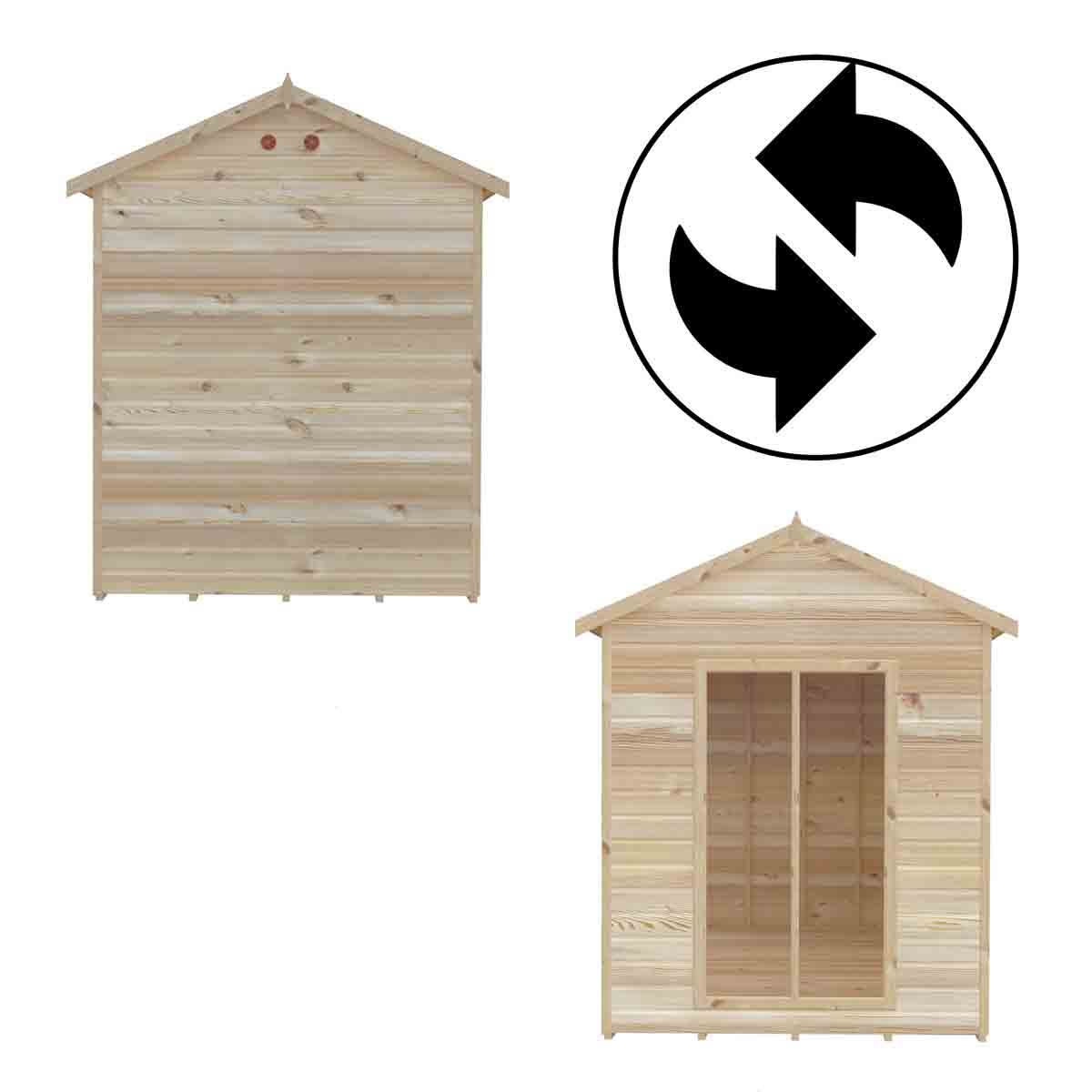 The Mayflower is a stunning, modern summerhouse with the fully glazed front and a large fixed side window providing lots of natural light, the glazing is acrylic for your safety. There are useful double doors giving easy access and these are also lockable. This lovely garden room is constructed from high grade 12 mm pine shiplap boards over sturdy 34 mm x 34mm framing. The floor and roof are 12 mm T&G with roof felt provided to complete the roof exterior. The modern design also allows for different window and door layouts to best suit your location. Dipped base coat preservative ready for you to top coat with a good quality wood paint or wood stain. Self assembly, fixings and instructions included.