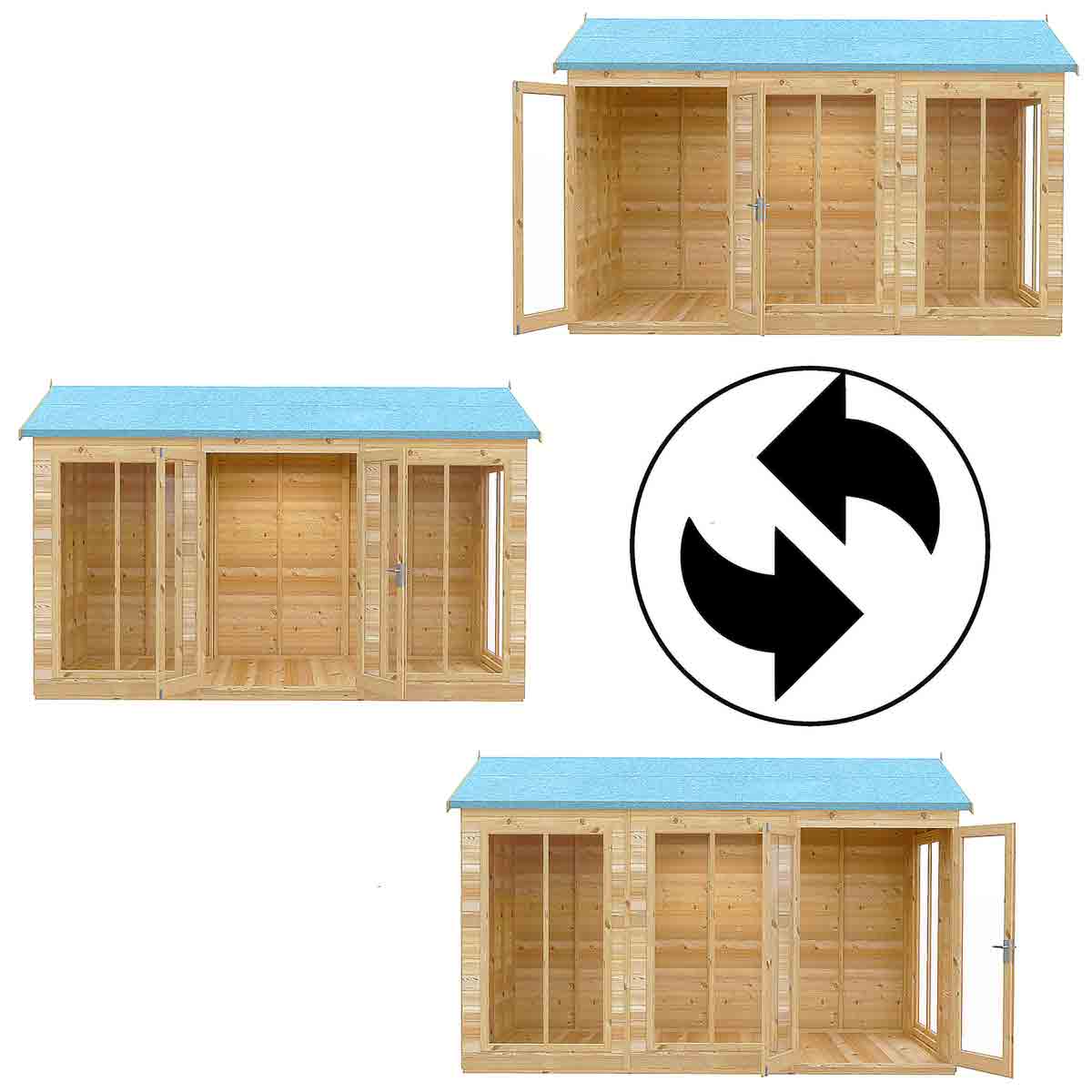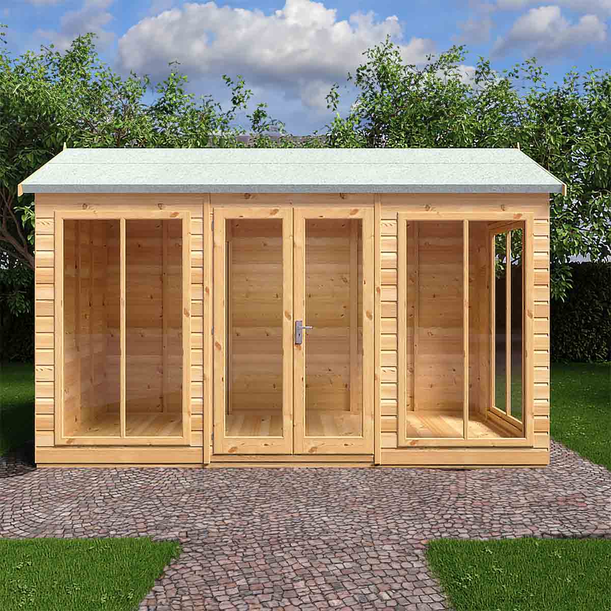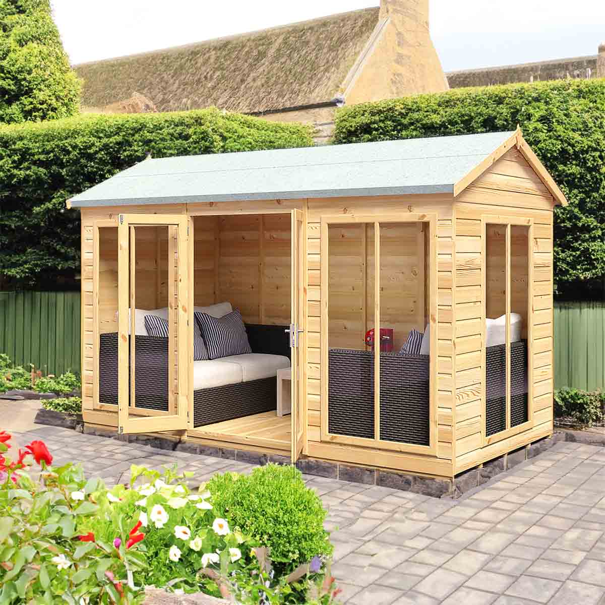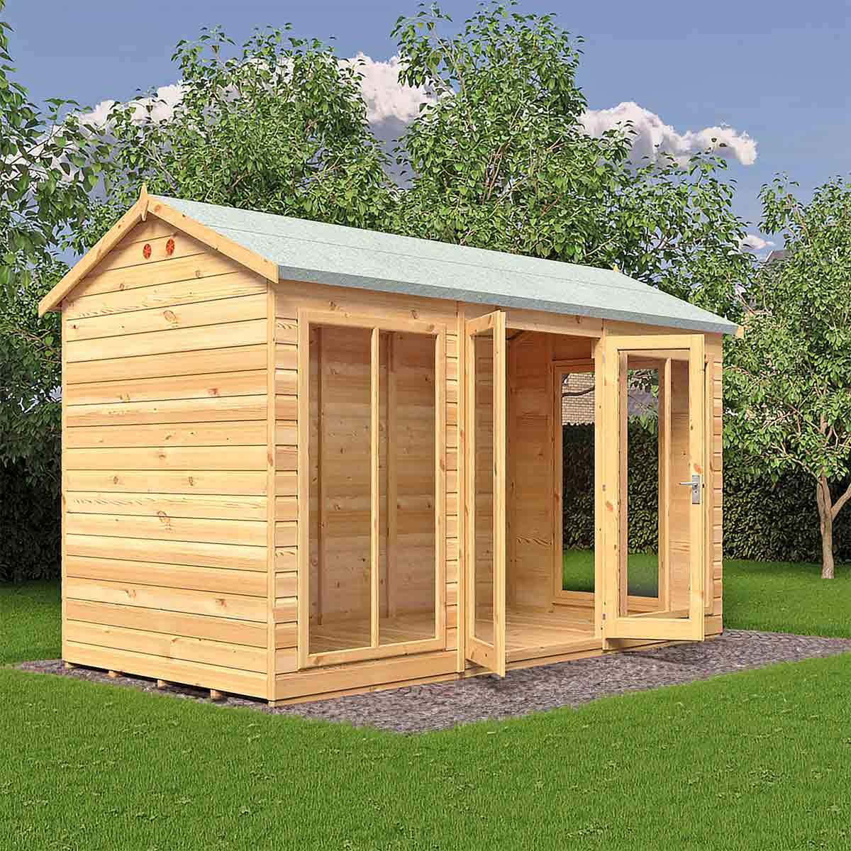 The Mayflower is a stunning, modern summerhouse with the fully glazed front and a large fixed side window providing lots of natural light, the glazing is acrylic for your safety. There are useful double doors giving easy access and these are also lockable. This lovely garden room is constructed from high grade 12 mm pine shiplap boards over sturdy 34 mm x 34mm framing. The floor and roof are 12 mm T&G with roof felt provided to complete the roof exterior. The modern design also allows for different window and door layouts to best suit your location. Dipped base coat preservative ready for you to top coat with a good quality wood paint or wood stain. Self assembly, fixings and instructions included.