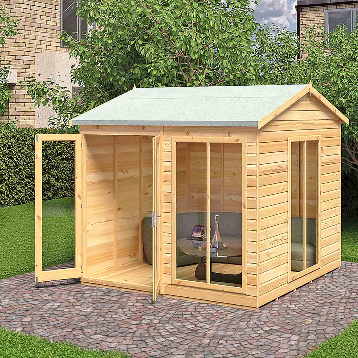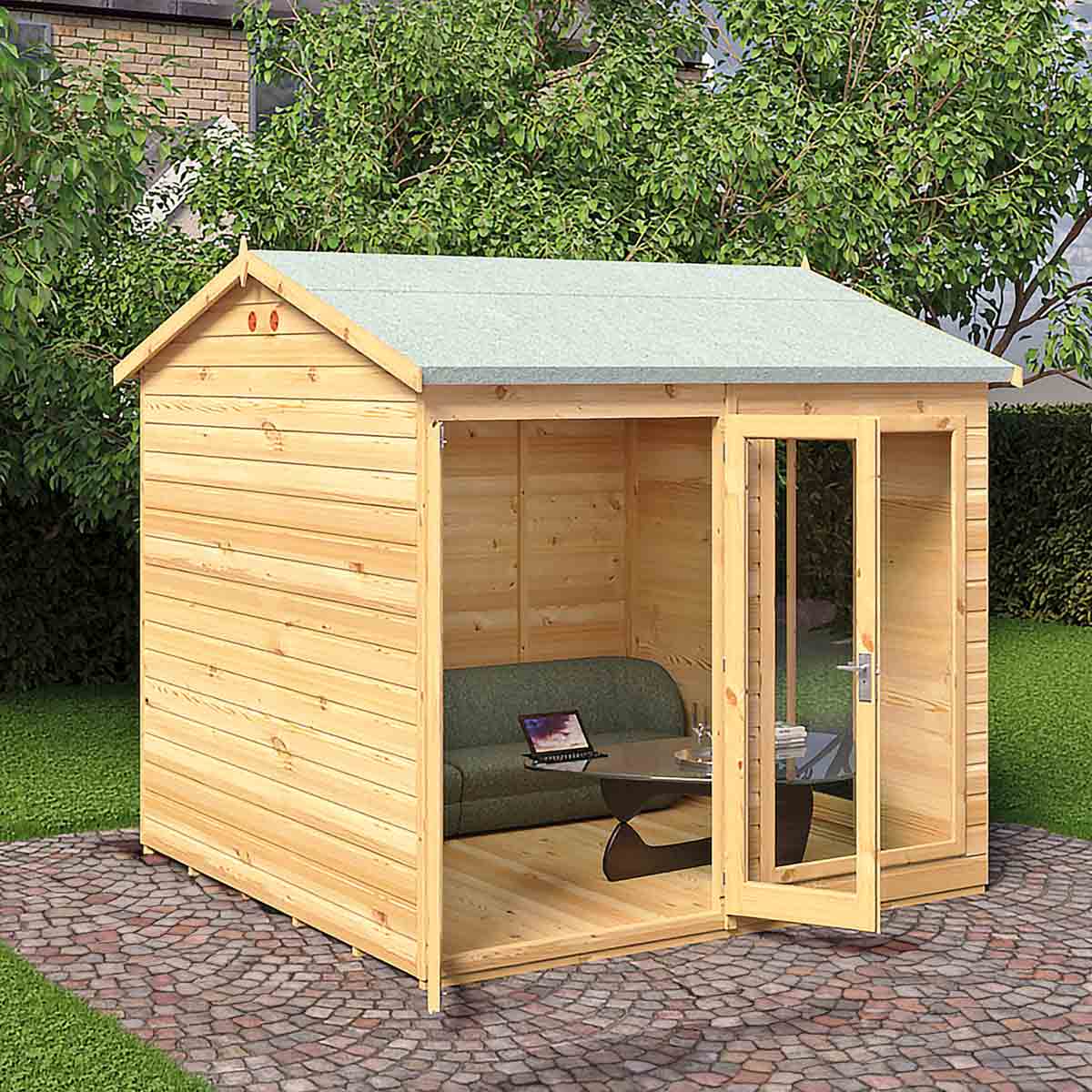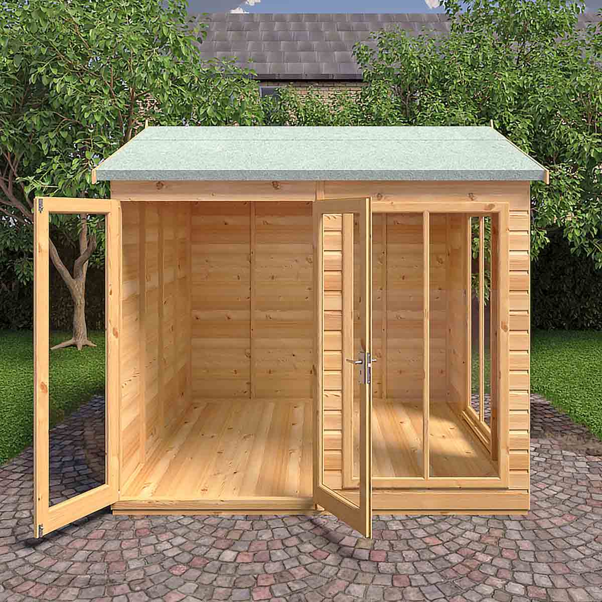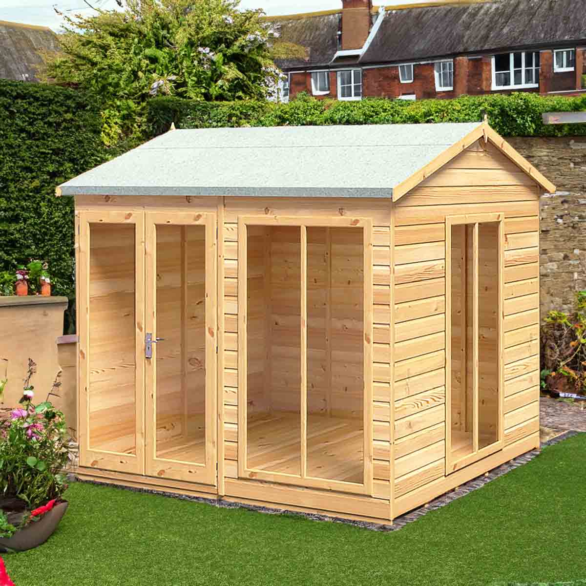 The Mayflower is a stunning, modern summerhouse with the fully glazed front and a large fixed side window providing lots of natural light, the glazing is acrylic for your safety. There are useful double doors giving easy access and these are also lockable. This lovely garden room is constructed from high grade 12 mm pine shiplap boards over sturdy 34 mm x 34mm framing. The floor and roof are 12 mm T&G with roof felt provided to complete the roof exterior. The modern design also allows for different window and door layouts to best suit your location. Dipped base coat preservative ready for you to top coat with a good quality wood paint or wood stain. Self assembly, fixings and instructions included.