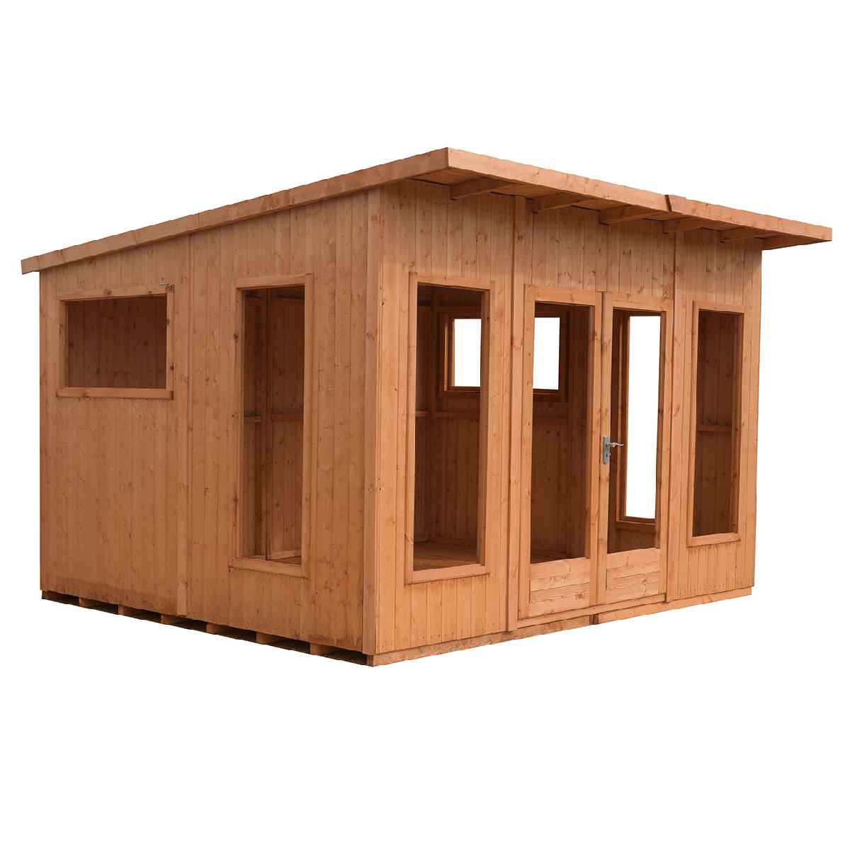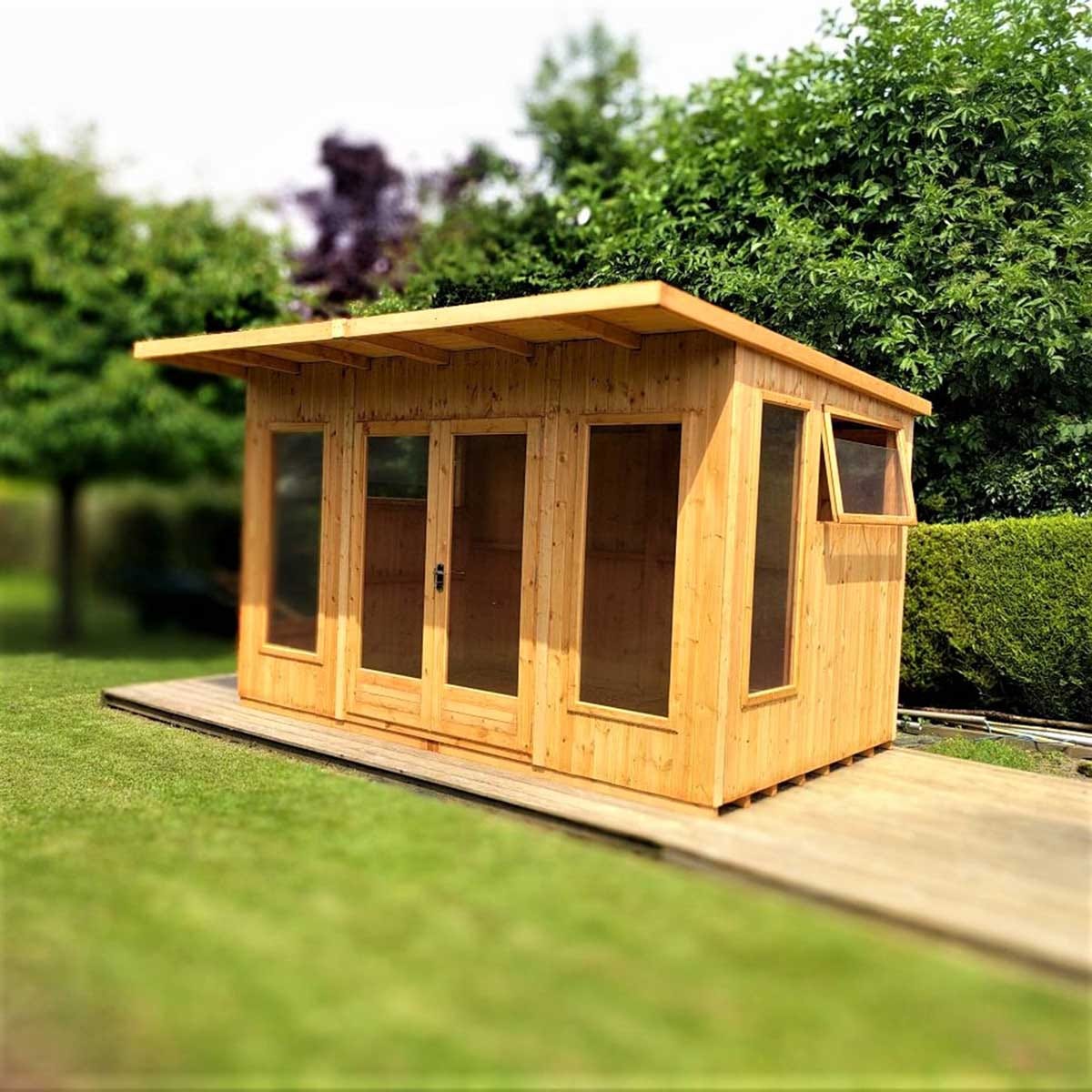 Featuring substantial, high quality double doors, you can open up your summer house with ease to enjoy copious amounts of fresh air. What's more, thanks to the small canopy to the front of the build, you will remain sheltered from the elements. Six large windows have also been incorporated into the design, four fixed and two with openings, to welcome plenty of daylight into your space throughout the day. The windows are glazed with styrene safety glazing, and created with storm resistant joinery to keep you nice and cosy inside if the weather takes an unexpected turn.
