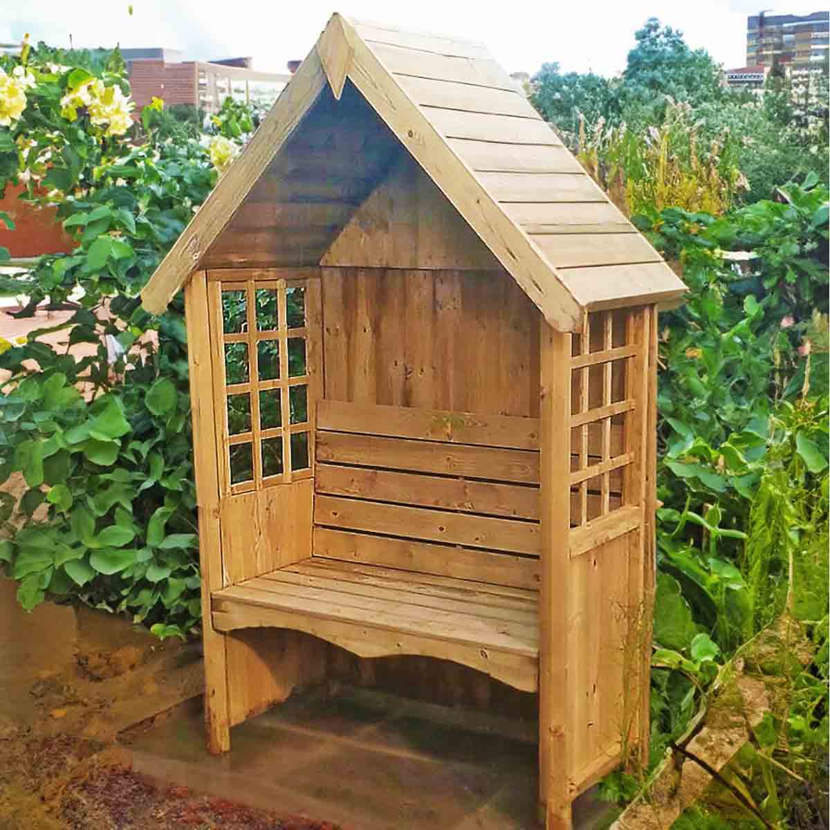 The Mimosa Arbour is a beautiful garden feature with a timber clad feature roof and integral seating with sloping back to add to your comfort.