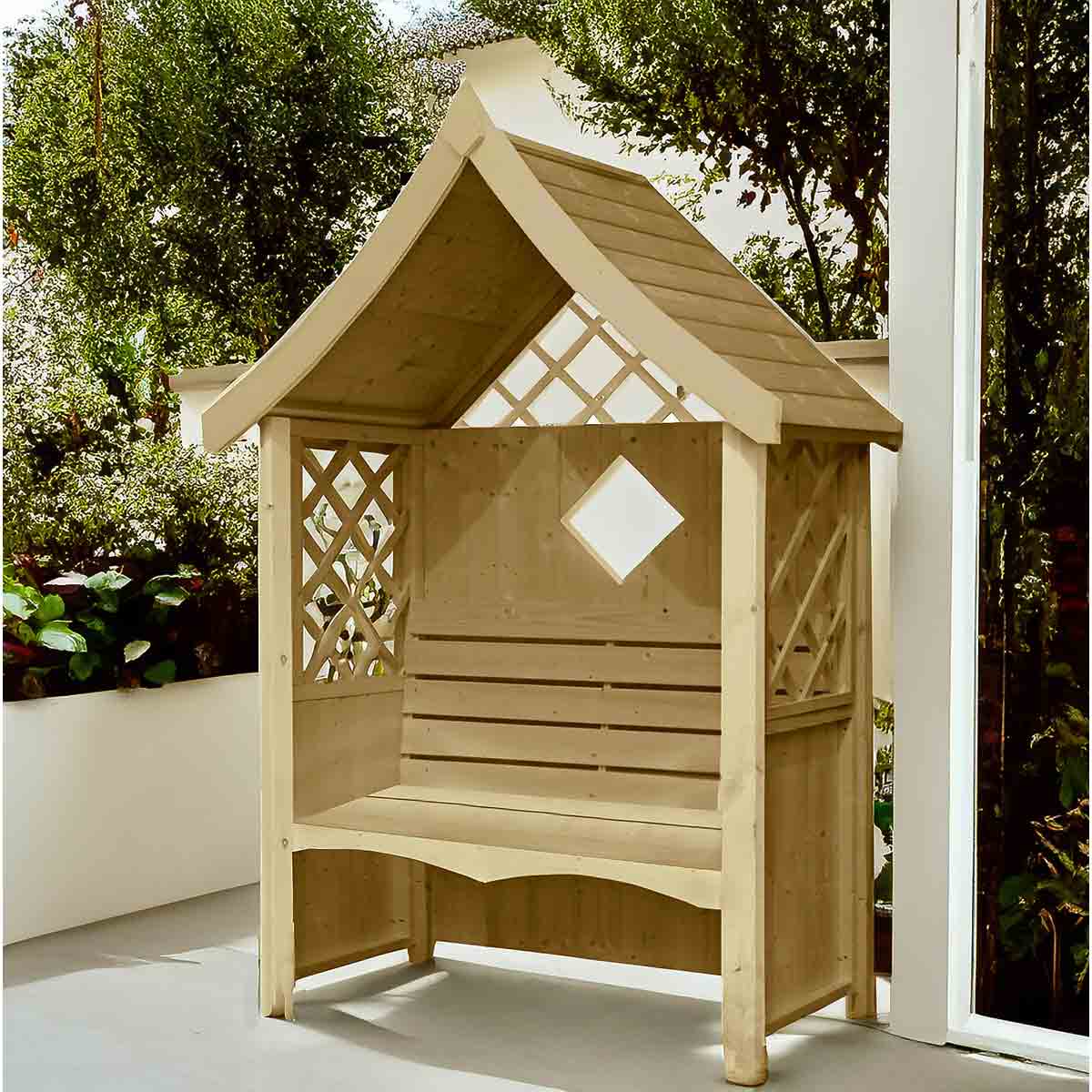 - Attractive design – This classic arbour features a sloping apex roof and charming trellis detail that will look elegant in any outdoor setting.