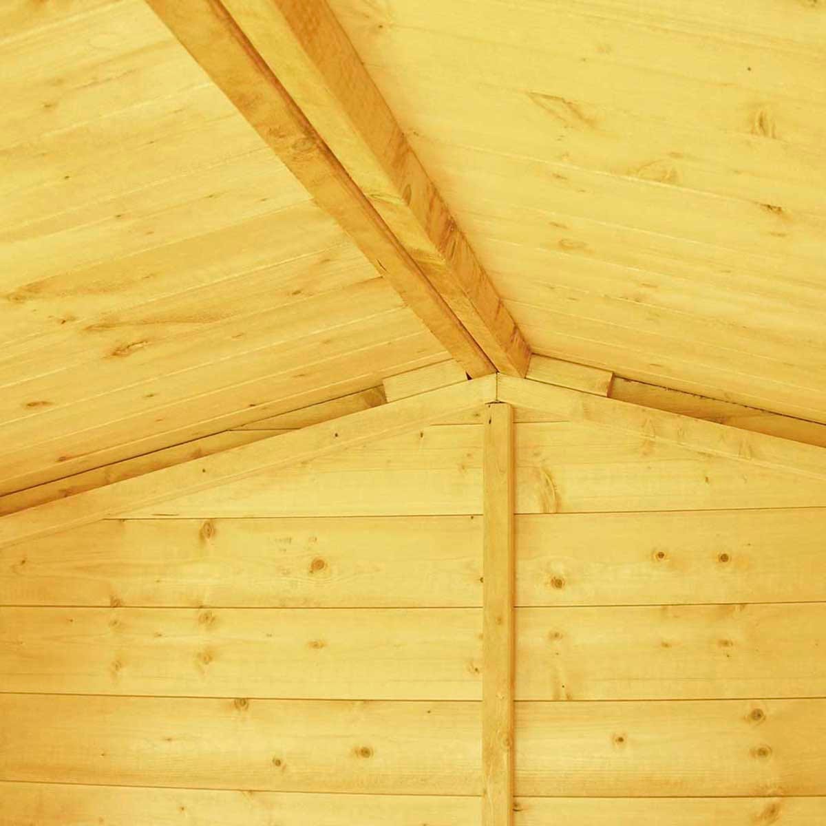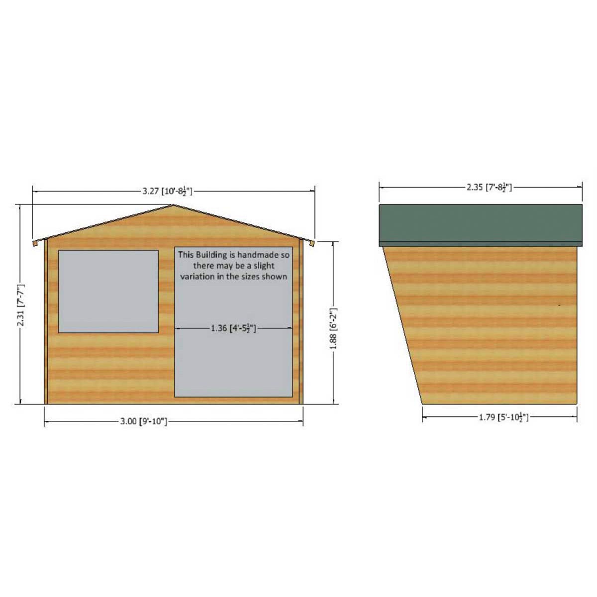 The roof and floor are both 12mm tongue and groove boards. The Summer house is supplied with a dip-treated base coat preservative ready for you to top coat to your choice immediately on installation; this could be a paint or a stain. The window and doors are joinery made quality and of a storm-resistant design. The enclosed area is approximately 10' x 6' with a small canopy over the front gable. Green mineral felt is included.
