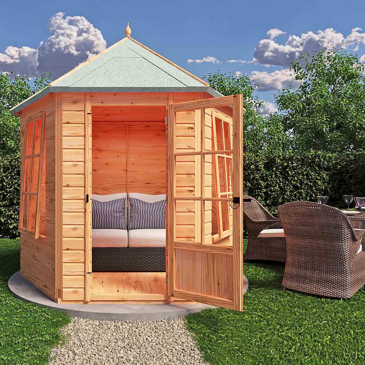Stylish Georgian windows and door make the hexagonal Welwick Summerhouse a wonderful feature in any garden, the perfect spot for a cup of tea! This pretty summer room is constructed on 34mm square framing and clad with planed Shiplap tongue and groove boards made only from the highest grade, slow grown, approved, northern European pine. The roof and floor are tongued and grooved timber. Two opening glass windows provide a welcome breeze! Dipped base coat preservative ready for you to top coat.