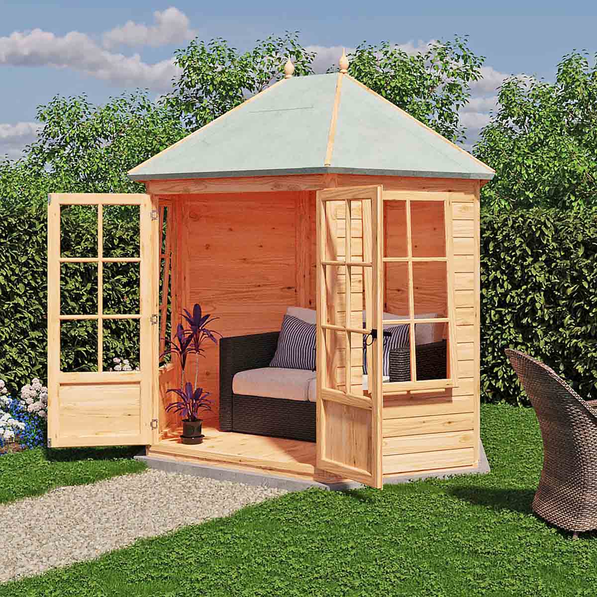 The attractively shaped Windermere Summerhouse gives you a lovely space to relax and makes a stylish feature too. With Georigan style glazing, the summer house is constructed on 34mm square framing and clad with planed Shiplap tongue and groove boards made only from the highest grade, slow grown, approved, northern European pine. The roof and floor are tongued and grooved timber. Two opening glass windows provide a welcome breeze! Dipped base coat preservative ready for you to top coat.