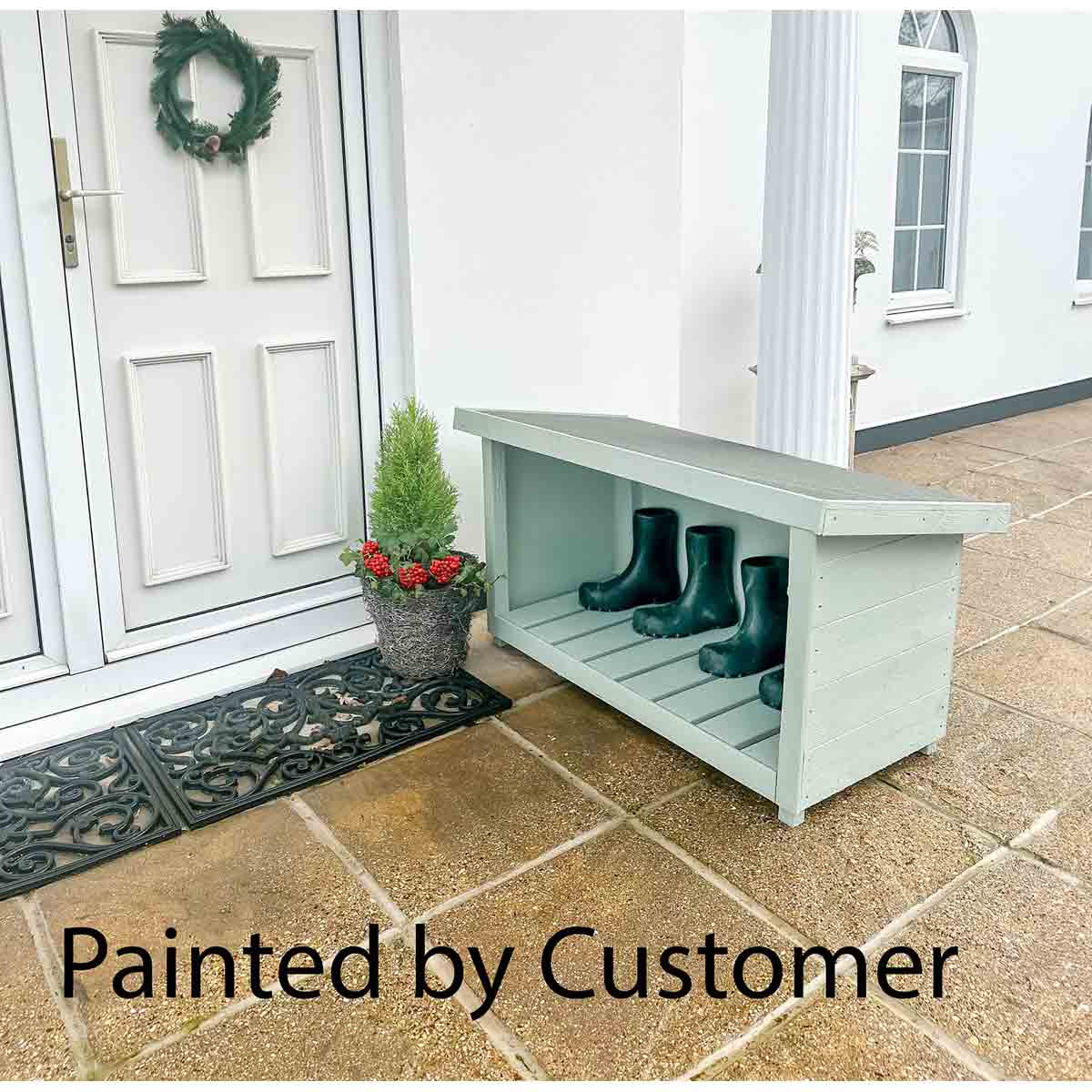 The Woodlowe Welly Store is perfect for keeping your family's footwear tidy! The welly store has a felt roof to help keep your boots dry and it is dip treated with a base coat preservative ready for you to top coat to your own preference immediately on installation. All fixings, felt and assembly instructions are provided. Following your order, you will be sent a link to choose your delivery day. On the morning of the delivery day you will also receive live tracking information. Painted images are to show what can be achieved with decoration.