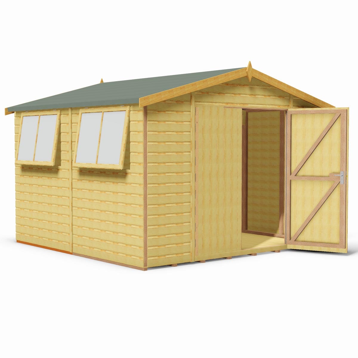 All of the timber is sourced only from very slow grown, high grade, European pine. The building is treated with a basecoat treatment ready for top coating by you immediately after installation.
